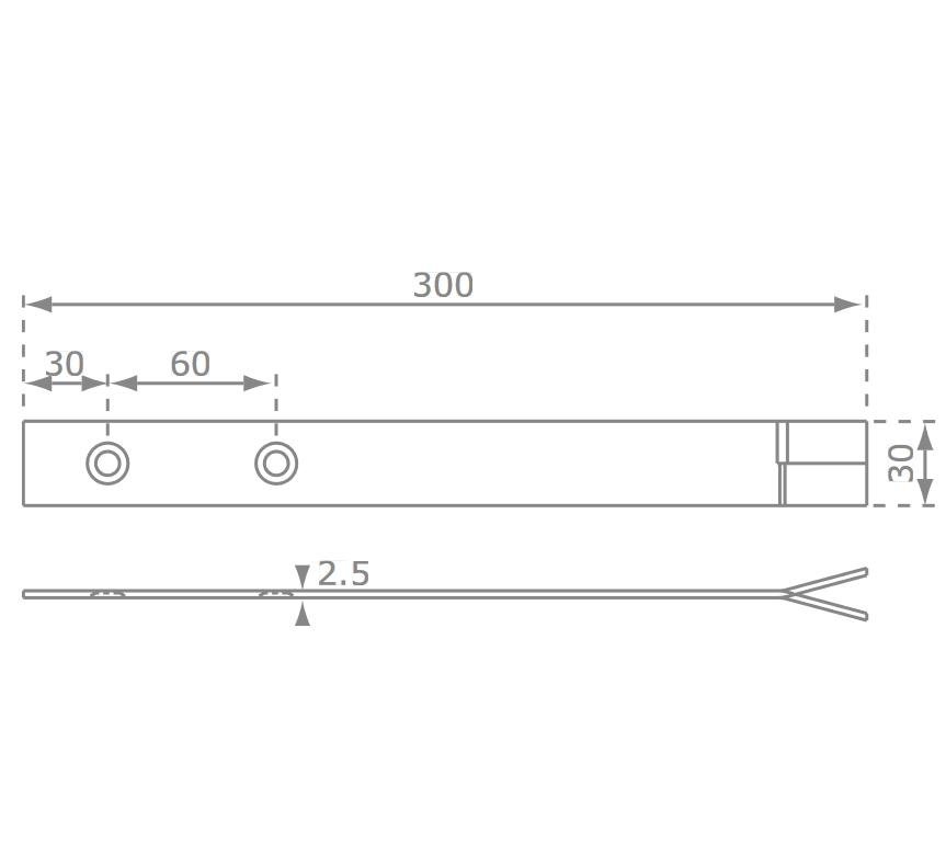 Las medidas son las siguientes: Longitud total 300 mm, a 30mm del primer agujero y 60 mm más el segundo; El grosor de la placa plana de 2,5mm.