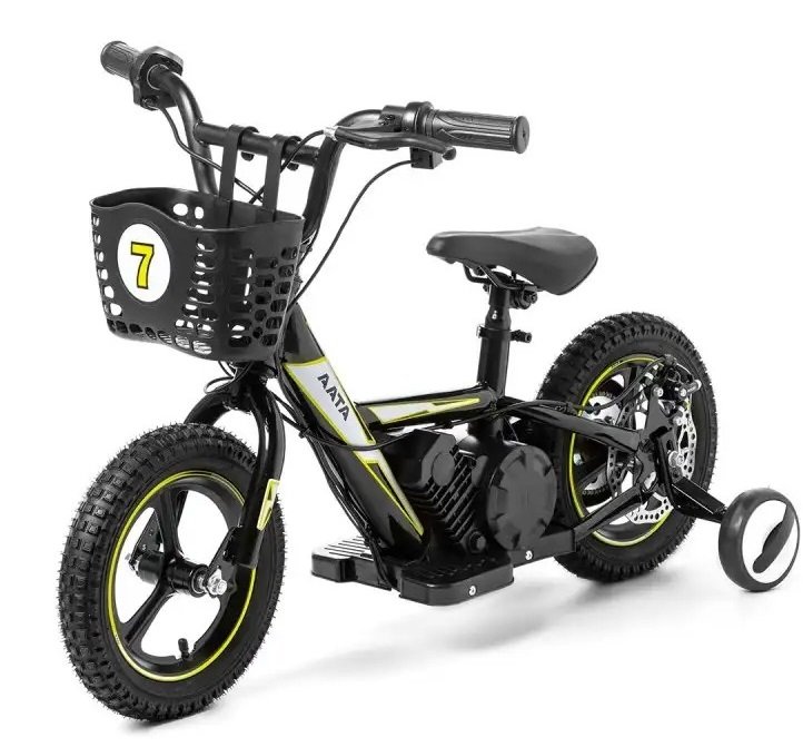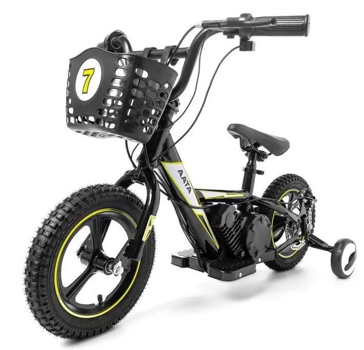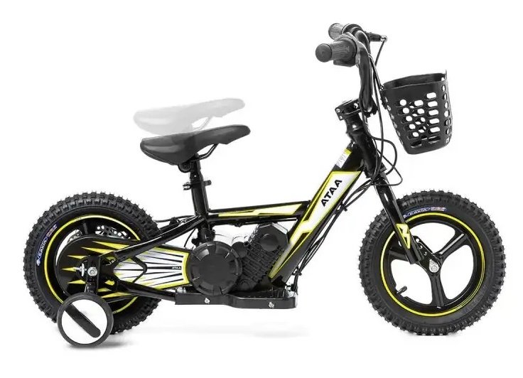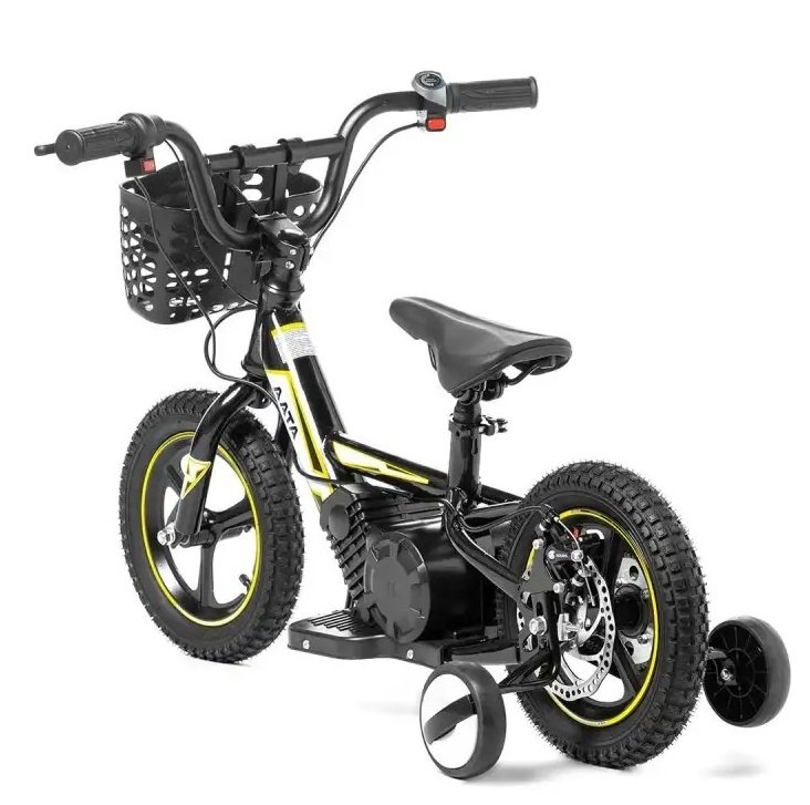 BICICLETA ELECTRICA 24V Y 12 PULGADAS, CON RUEDINES Y CESTA, amarilla – 2-7 AÑOS – INDA695-AT