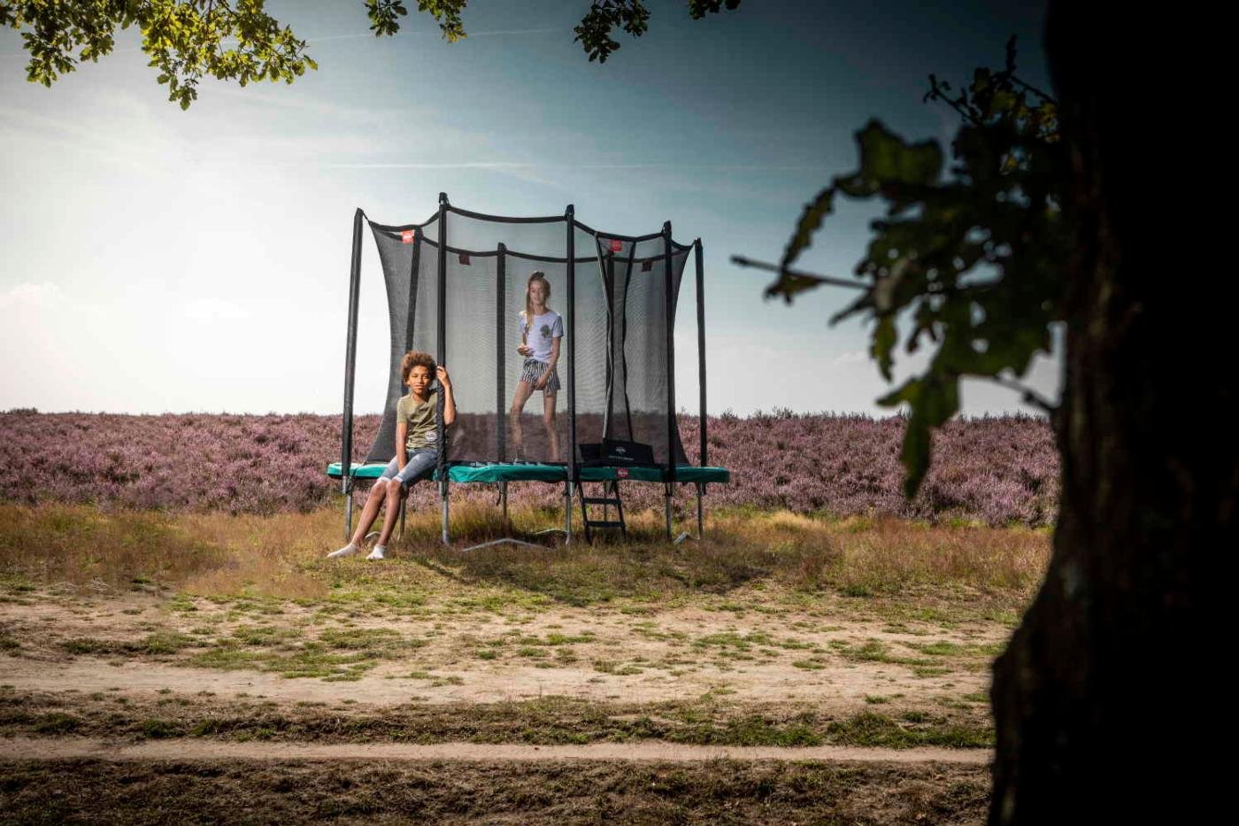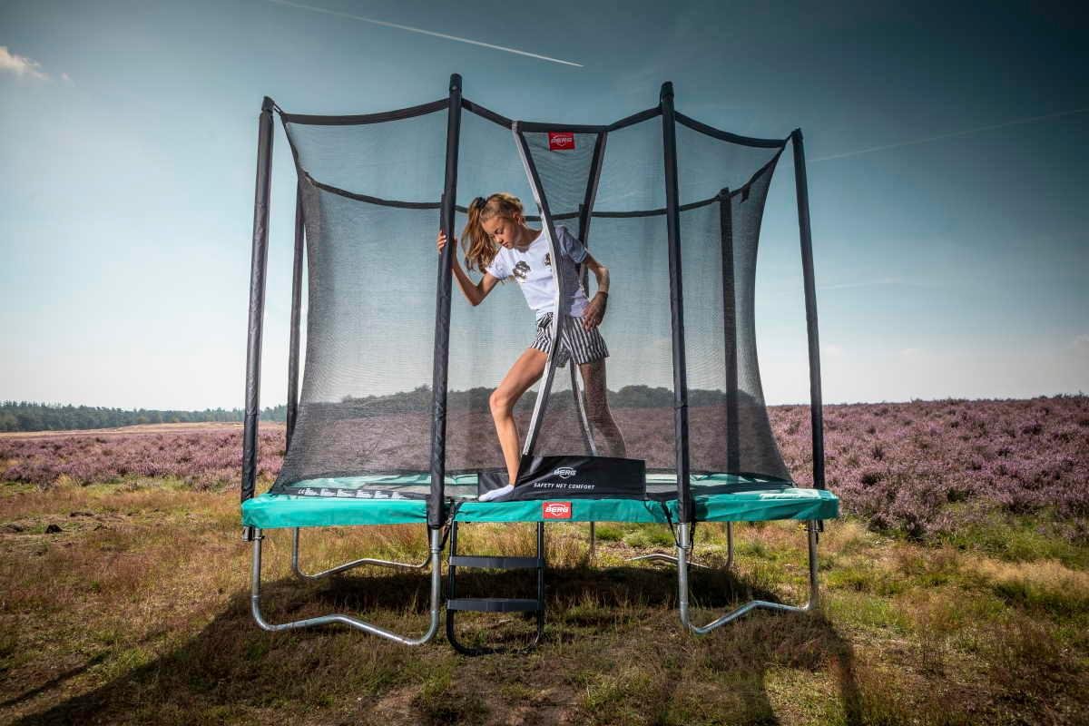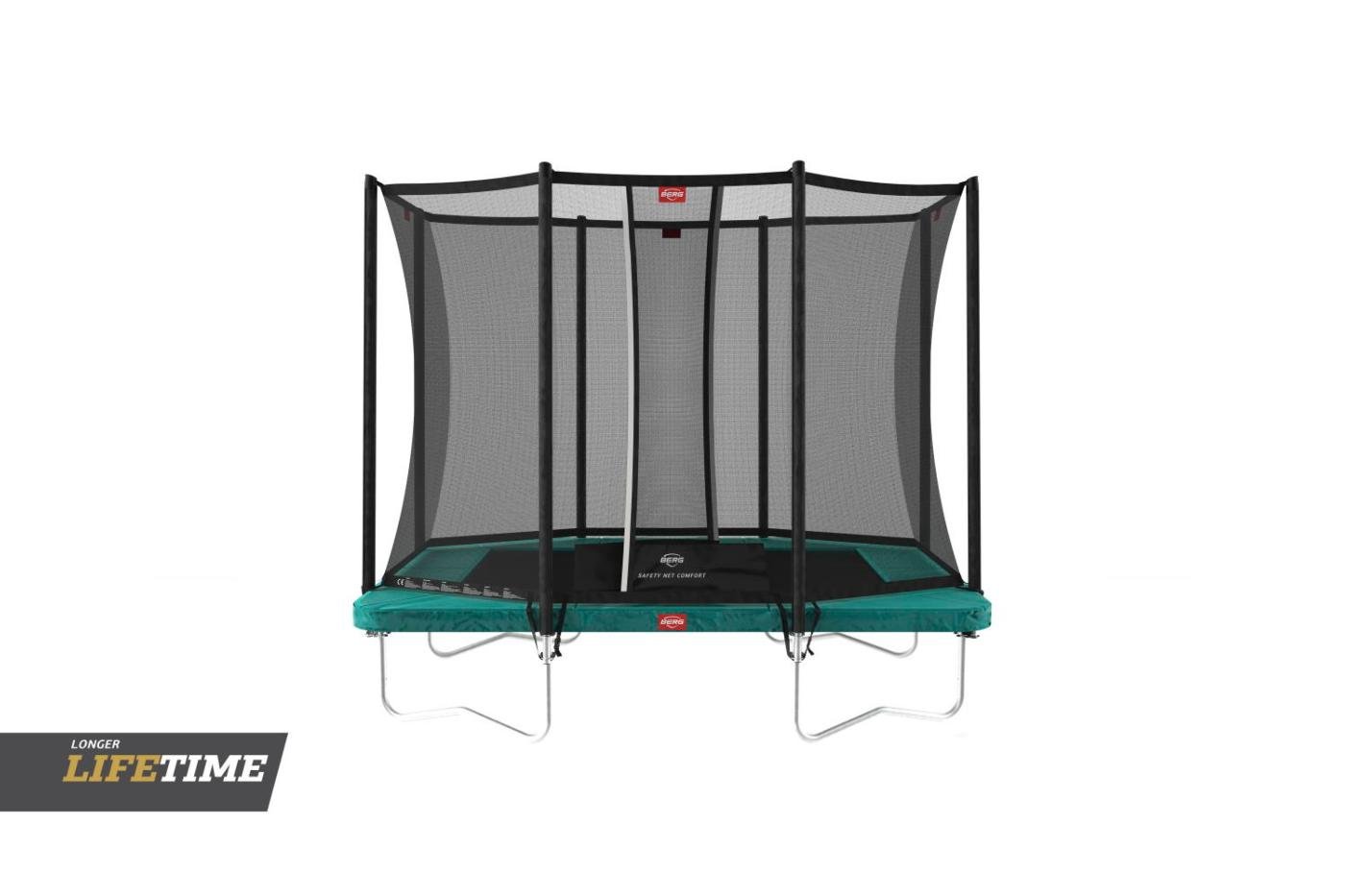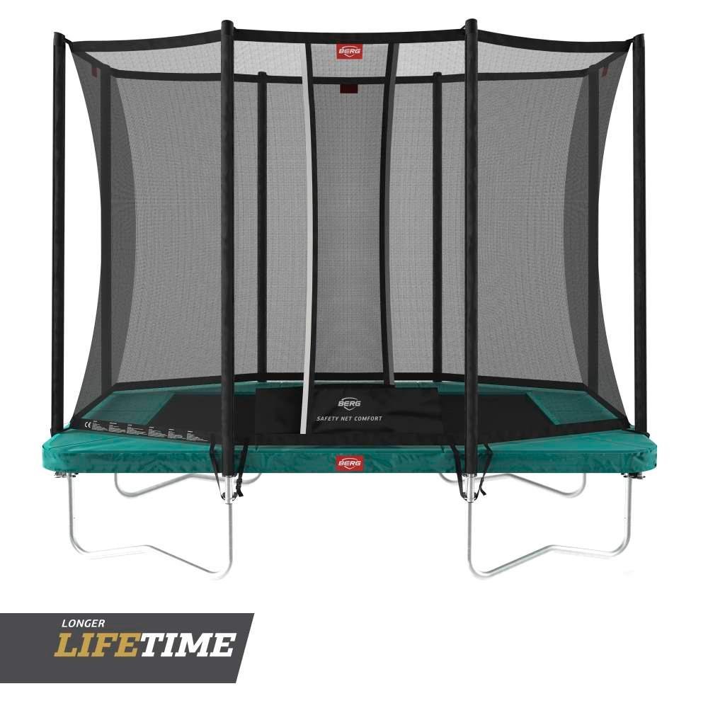 Cama elástica rectangular BERG Ultim Favorit 280 con red de seguridad Comfort, una cama elástica de la mejor calidad con el innovador sistema de muelles Goldspring que le da el mejor salto. La estructura del trampolín está bien protegida para el exterior y tiene un elegante color negro que le da una protección extra. La red de seguridad Comfort bien integrada en la cama elástica mantiene siempre la red firme. La cama elástica BERG Ultim Favorit 280 Green tiene un borde protector muy ancho y grueso.