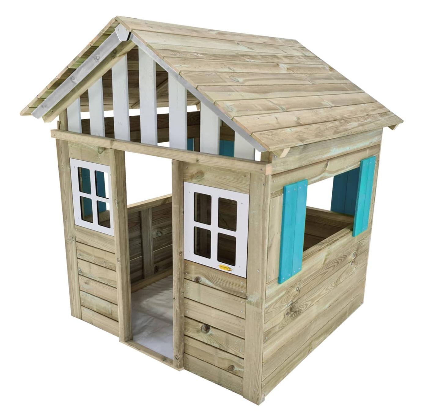 El perfil del tejado y los laterales de las ventanas cuentan con detalles en color azul. La casita está homologada para uso público, por lo que no tiene puerta ni otros elementos móviles.