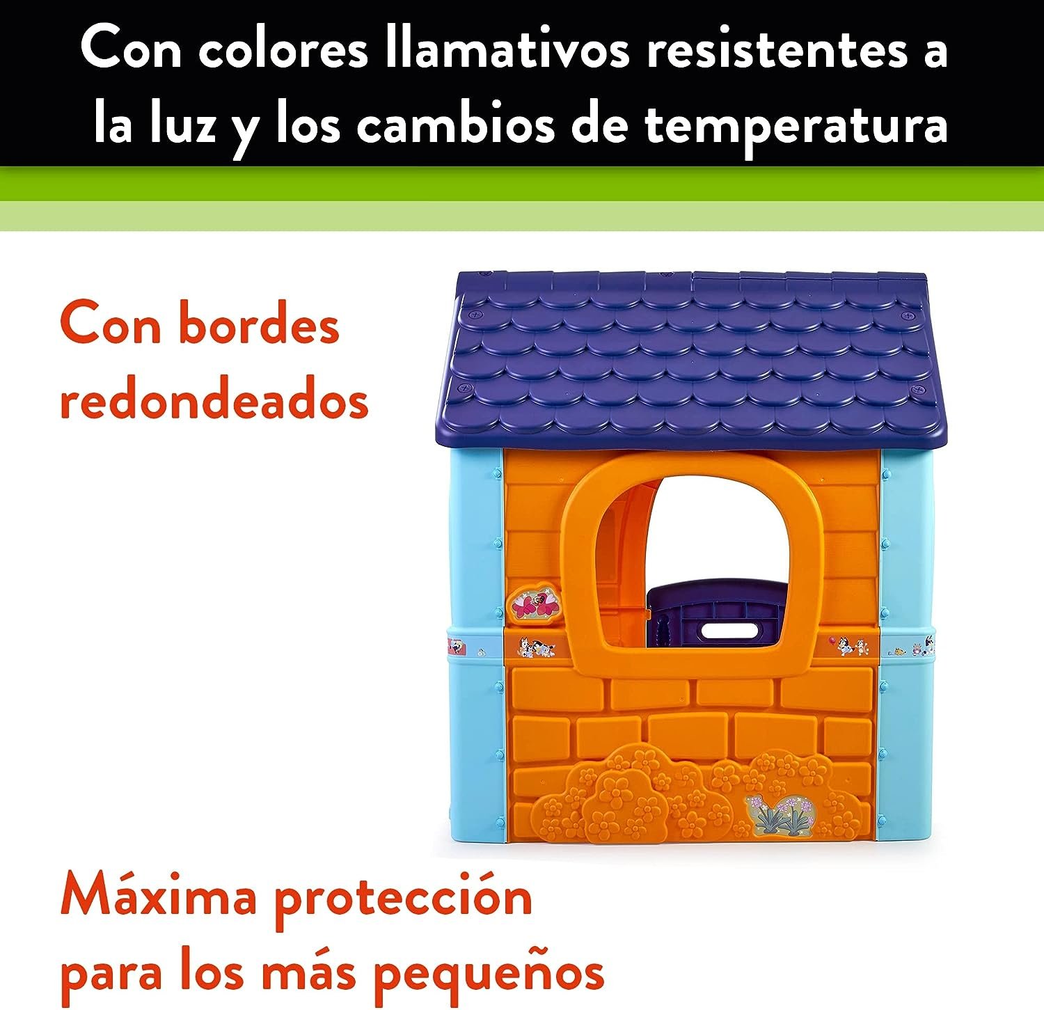 Fantasy House Bluey tiene colores muy luminosos resistentes a la luz solar y a los cambios de temperatura; es de colores azul y naranja, y la puerta y el tejado son azules oscuro