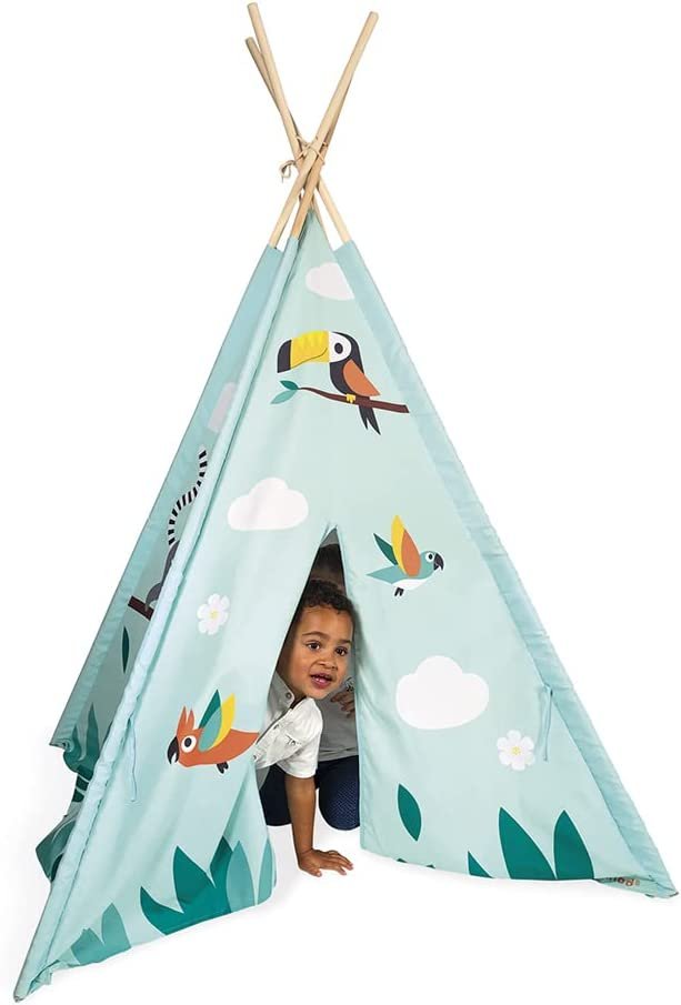 ¡En mi tipi hago lo que quiero! Para un momento de tranquilidad, momentos de juego o para jugar al escondite, ¡este adorable tipi de madera y tela encajará en la habitación de tu hijo, en su sala de juegos o en la sala de estar! Ideal para imaginarse mil historias en su propio escondite, este tipi infantil es apto para niños de a partir de 2 años. ¡Podrán instalarse cómodamente y dejar que su imaginación vuele, aislarse y jugar solos, o invitar a familiares y amigos! Se abre la entrada (95 cm de altura) y se atan las dos alas en sendos lados con la ayuda de las cintas. Este tipi consta de 4 varillas de madera con certificado FSC®, cada una dividida en 3 piezas: para facilitar el montaje/desmontaje, las 3 piezas están conectadas por tubos de plástico. Montaje por parte de un adulto. ¡La tela del tipi está bonitamente decorada con un estilo exótico y se puede lavar a máquina! Además, puedes llevarte el tipi a todas partes gracias a su práctica funda de almacenamiento con asa, lavable a máquina. Esta bonita cabaña aportará un toque colorido a tu decoración y será un cómodo refugio para tu hijo.
