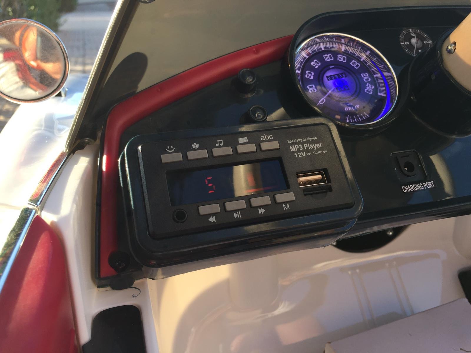 También tiene una bocina, música, sonido de arranque del motor , entrada USB, MINI-SD y MP3 , luces LED, cinturón