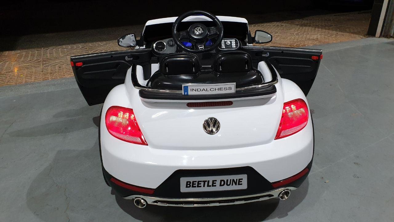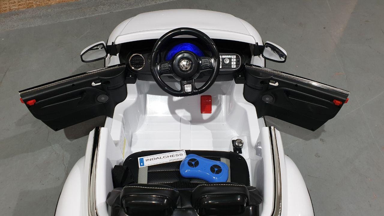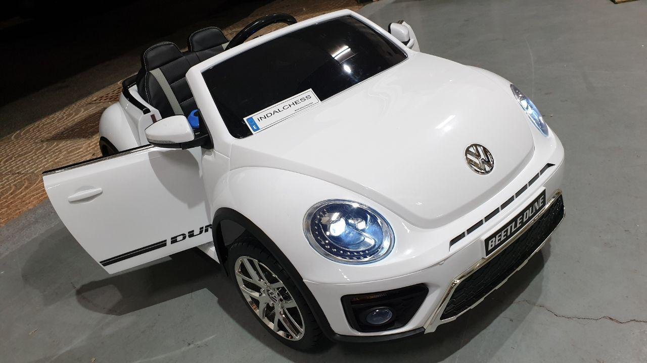 Este gran auto para niños Volkswagen Beetle se fabrica bajo la licencia de Volkswagen. Con los 2 potentes motores de 12 voltios, el vehículo infantil Beetle alcanza una velocidad de hasta 6 km por hora. Además, este vehículo con batería está equipado con muchas opciones, tales como: 2 puertas reales, neumáticos totalmente de goma, asiento de cuero artificial, ruedas de suspensión, iluminación LED, bocina, música y radio FM. Los niños pueden tocar su propia música si es necesario. La conexión Bluetooth incorporada, mini SD y / o conexión USB.