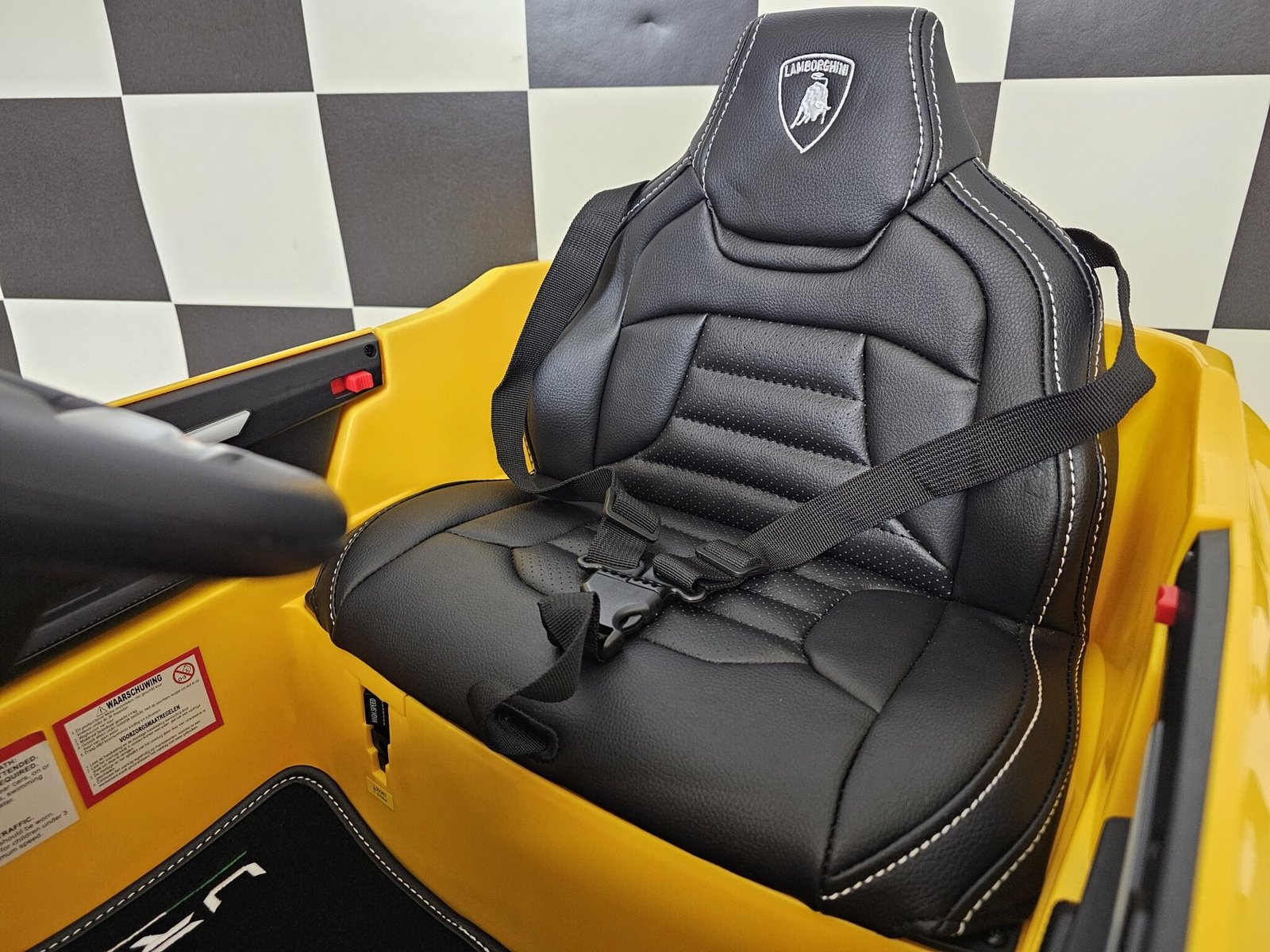 Asiento de cuero y ruedas de goma eva.