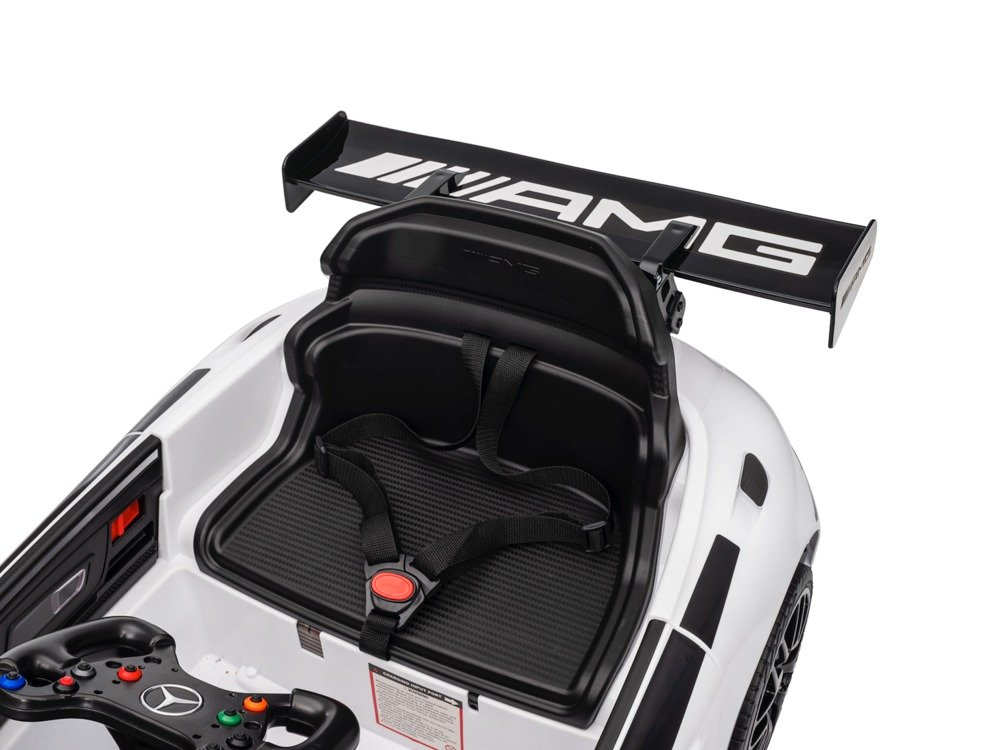 Neumáticos de goma, asiento de cuero artificial con cinturón de seguridad.
