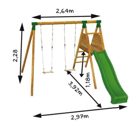 Medidas: 2,97 m (largo) x 3,92 m (ancho hasta el extremo del tobogán) x 2,28 m (alto)
