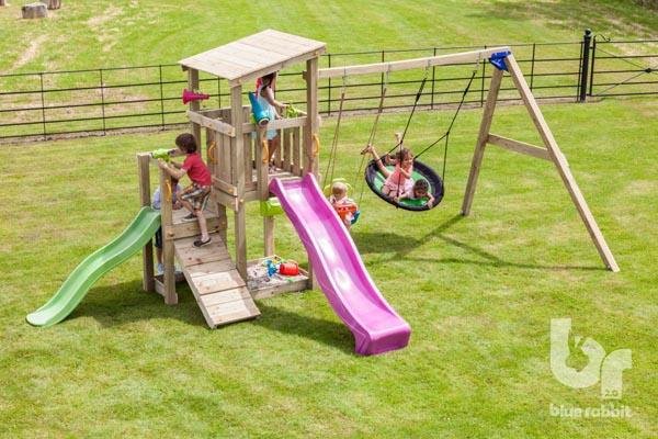 Los parques infantiles de la marca Blue Rabbit están homologados para el jardín de una casa particular. La gama de torres de juego BlueRabbit está completamente desarrollada internamente por un equipo de experimentados diseñadores, para asegurar un resultado con construcciones sólidas, con un diseño fresco y atractivo. Para garantizar el máximo nivel de calidad y seguridad, todas las estructuras de juego son revisadas, probados y certificados por TÜV Nord