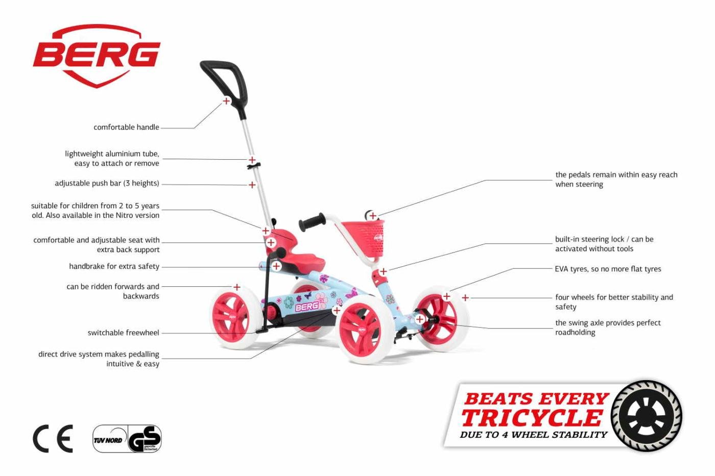 El cuadriciclo evolutivo BERG BUZZY BLOOM es ligero y con un manillar parecido a los que llevan los triciclos pero es un vehículo mucho más estable para que los niños se mantengan siempre seguros encima del cuadriciclo. Incluso en las curvas más cerradas los conductores quedarán pegados a los pedales.
