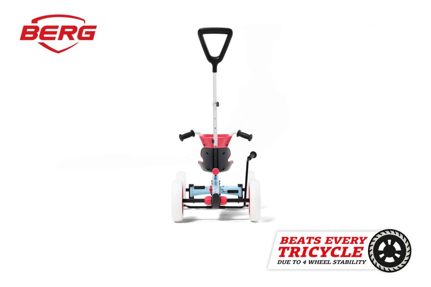 El coche de pedales Buzzy BLOOM es dos cuadriciclos en uno. Por un lado es un coche de pedales como el BERG BLOOM, más estable y fácil de conducir que un triciclo, con ruedas de EVA que nunca se pinchan y sirven para conducir tanto por dentro de casa como por fuera, en el jardín. Pero cuando los niños se cansan y hay que volver a casa, se le puede poner la barra de empuje graduable y ligera (de aluminio), se desconecta el piñón fijo y se conecta el piñón libre para que se muevan las ruedas pero no los pedales y se fija el manillar, operación que se hace en 5 segundos, sin herramientas. Esta versión del BERG Buzzy BLOOM tiene además un freno de mano.