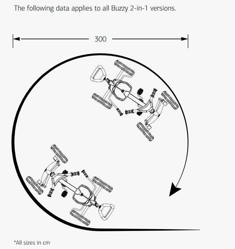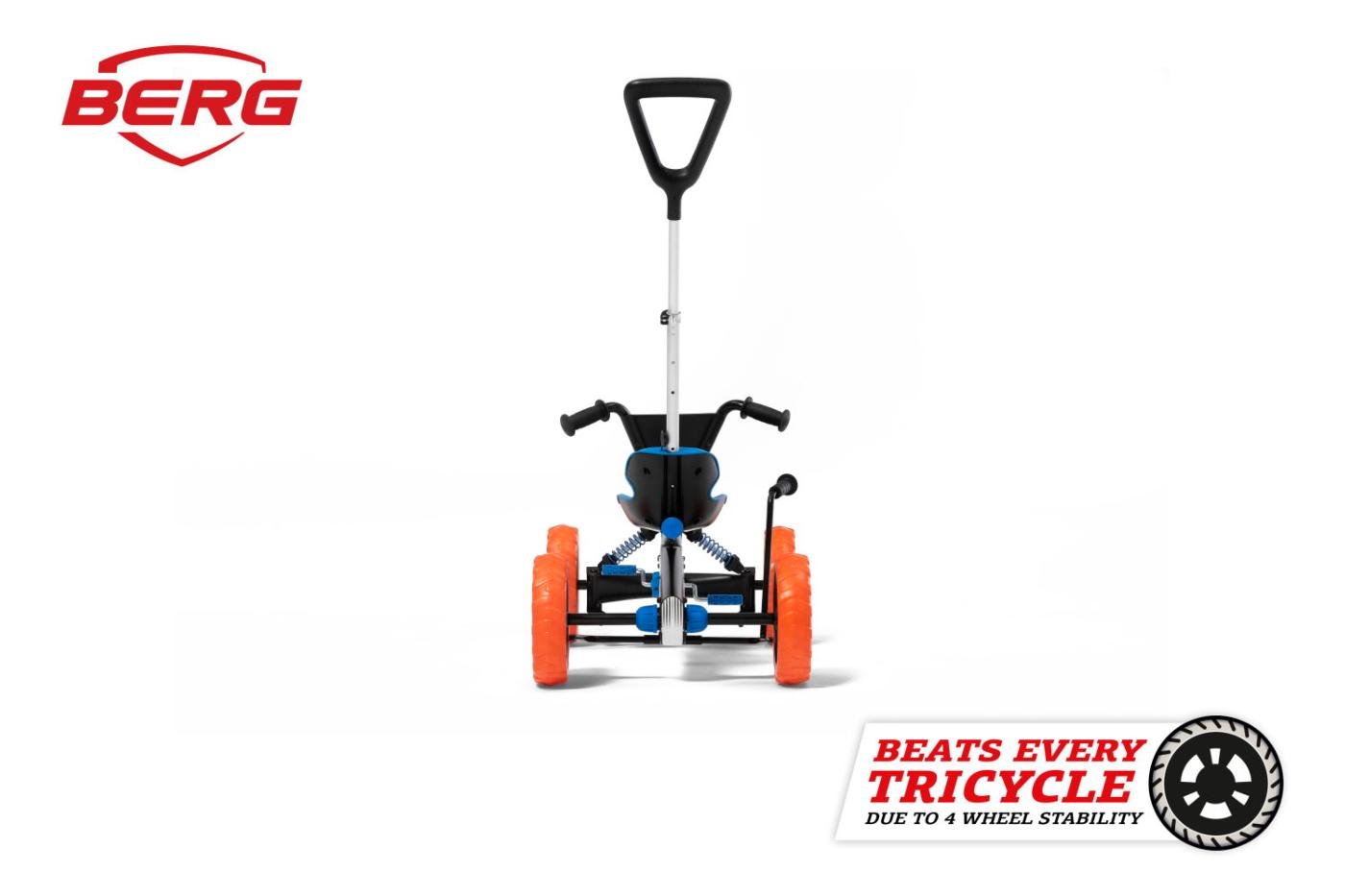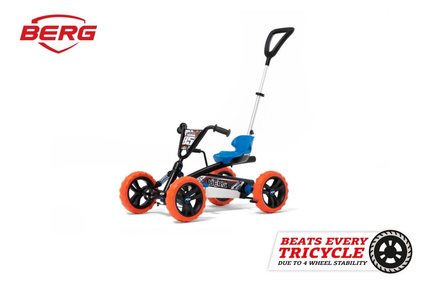 El coche de pedales Buzzy NITRO es dos cuadriciclos en uno. Por un lado es un coche de pedales como el BERG NITRO, más estable y fácil de conducir que un triciclo, con ruedas de EVA que nunca se pinchan y sirven para conducir tanto por dentro de casa como por fuera, en el jardín. Pero cuando los niños se cansan y hay que volver a casa, se le puede poner la barra de empuje graduable y ligera (de aluminio), se desconecta el piñón fijo y se conecta el piñón libre para que se muevan las ruedas pero no los pedales y se fija el manillar, operación que se hace en 5 segundos, sin herramientas. Esta versión del BERG Buzzy Nitro tiene además un freno de mano.