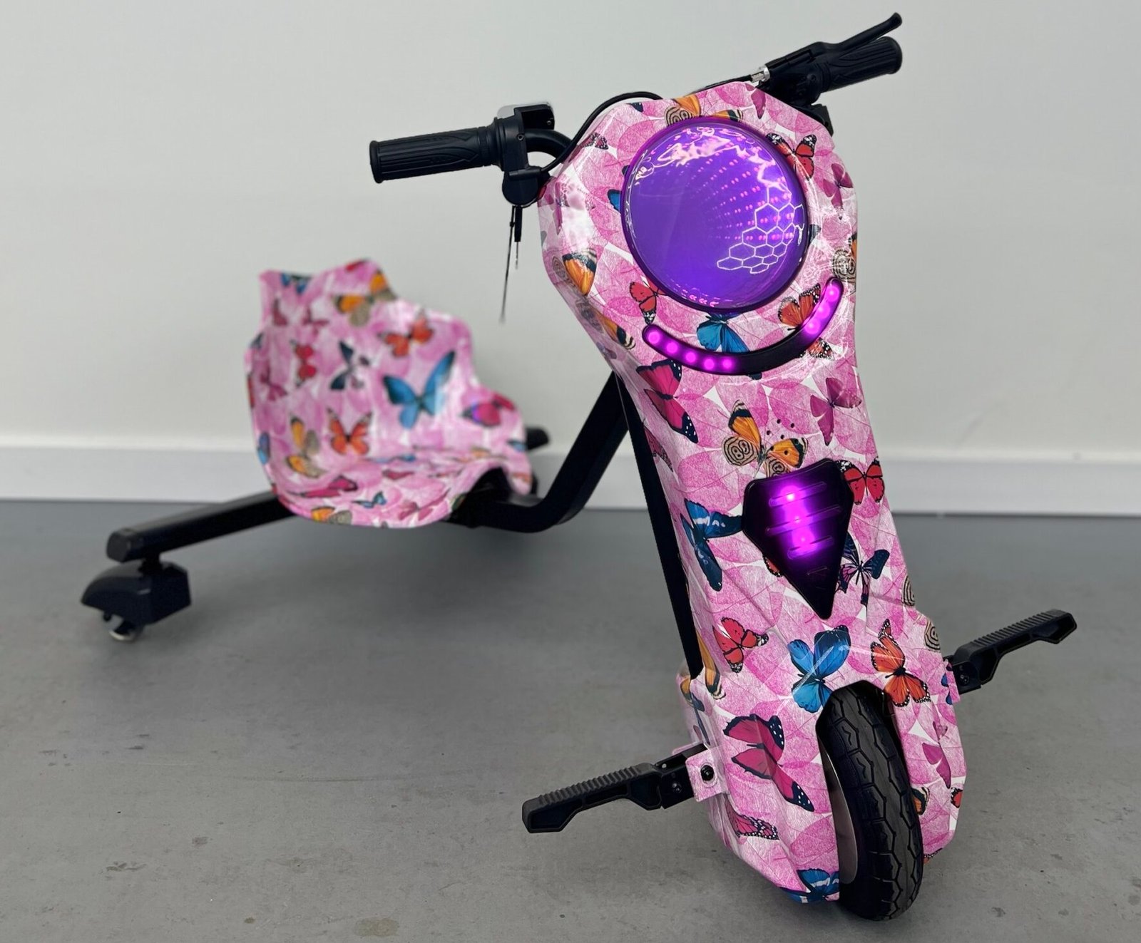 ¡Diversión garantizada con este espectacular triciclo eléctrico de derrapes para niños! Su diseño con mariposas y luces LED multicolor lo convierte en el regalo perfecto para los pequeños pilotos que buscan emoción y estilo.