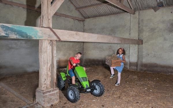 Especialmente en la granja es donde puedes encontrar la libertad y el espacio para disfrutar de los juegos al aire libre. El tractor de pedales BERG Deutz Fahr BFR-3 con cambio de marchas es tu vehículo para pasarlo en grande en la granja. Es un vehículo a pedales con la licencia oficial y el diseño basado en los tractores reales. El cuadriciclo de pedales está equipado con unas impresionantes ruedas de tractor que se agarran muy bien a la tierra del campo. Con el tubo de escape frontal y los colores característicos es un vehículo a pedales para los jóvenes granjeros y los amantes de la marca Deutz Fahr.
