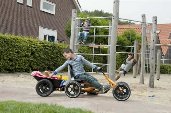 Este remolque tiene las ruedas de neumático, es fácil de enganchar a los coches de pedales y es fuerte.
