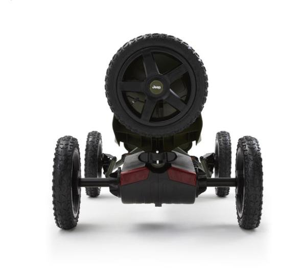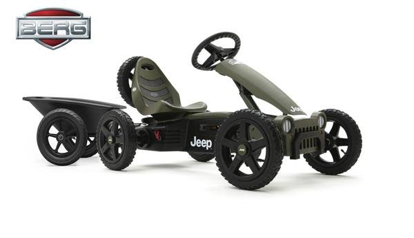 El Berg Jeep Adventure es un coche de pedales ligero y compacto con todo lo necesario para conducir por pistas de tierra. Está equipado con unos neumáticos todo terreno, una rueda de repuesto y un gancho de remolque por si se quiere poner un remolque (no incluido)..