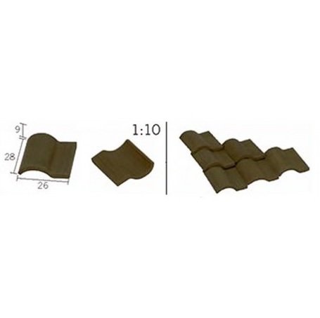 medidas por unidad; 3cms x 3cms. Escala 1/10. Color negro. Tipo teja romana. Material; cerámica.