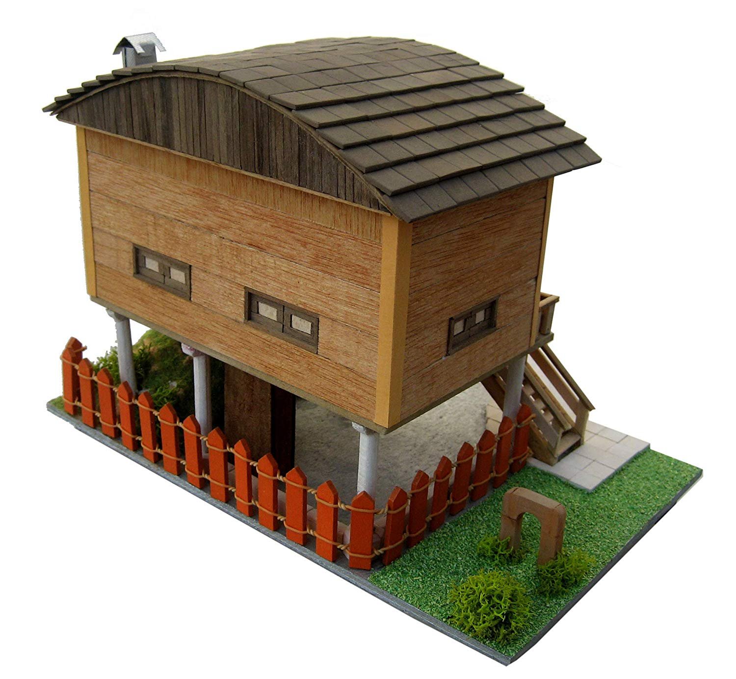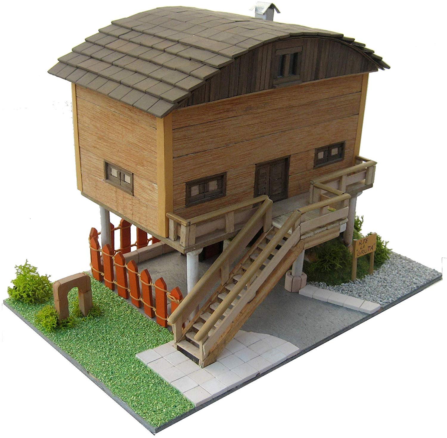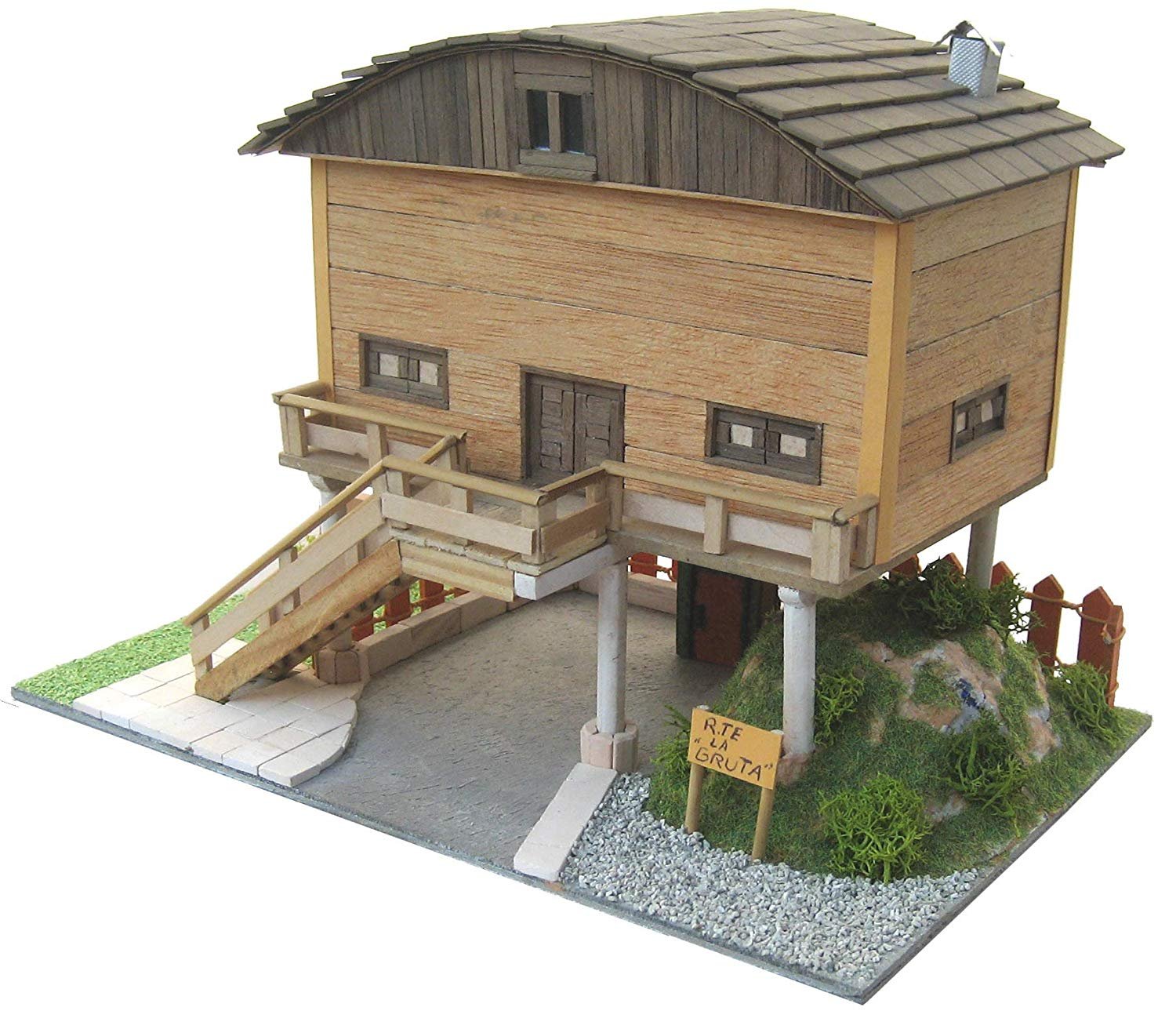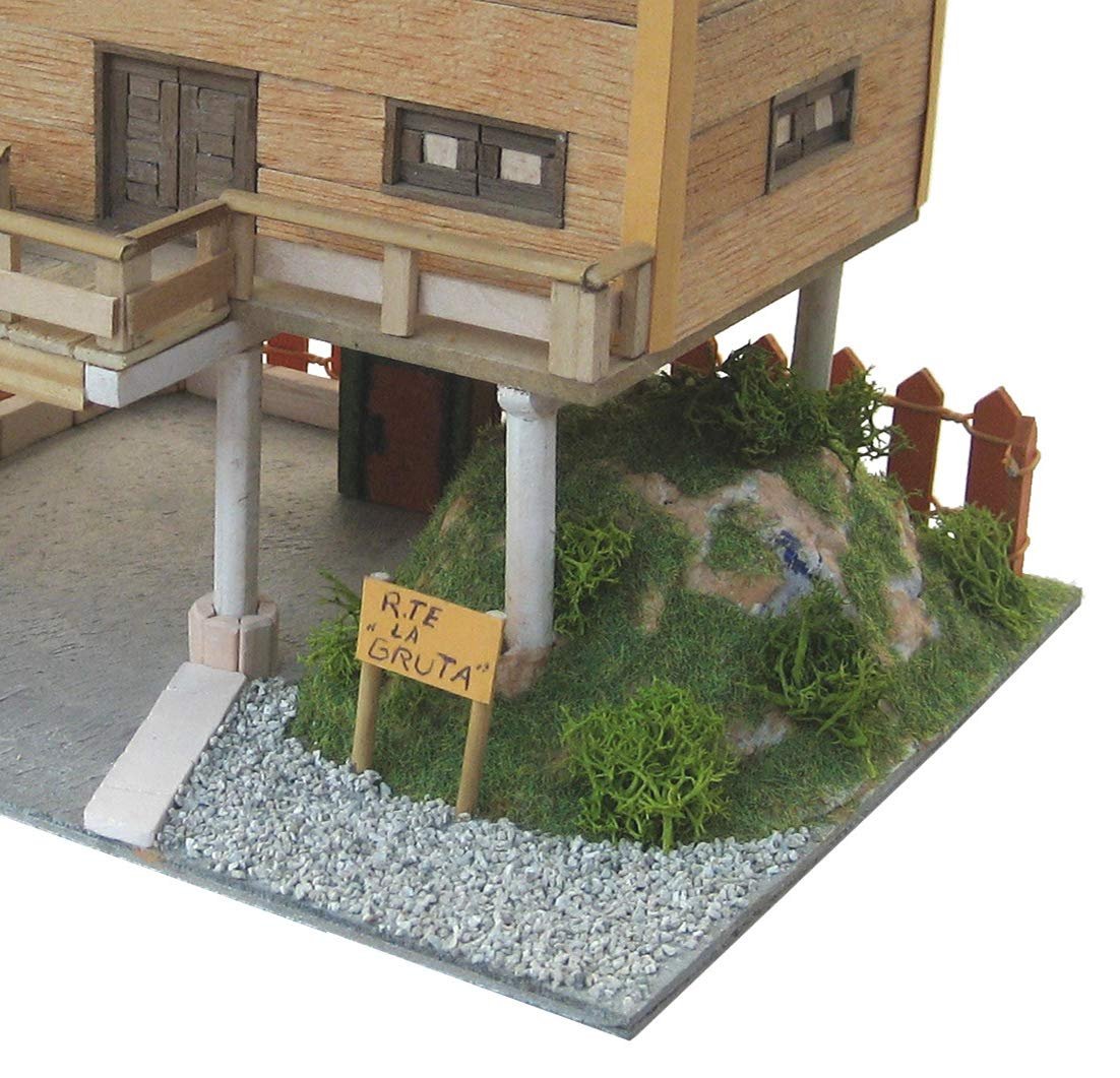 Kit de montaje fabricada por Keranova, modelo 30253, reproducción a escala del restaurante la Gruta. Incluye todo lo necesario para su construcción: tablero base DM, plantillas de cartón, variedad de piezas de cerámica en tamaño y color (normalmente marrón y rojo, pero también blanco, negro y gris), listones y varillas de madera de distintas medidas y material decorativo, así como otros tipos de materiales necesarios como escayola, cartón-piedra etc. Las instrucciones son detalladas y con fotos para fácil itar el montaje.