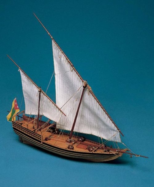El modelo reproduce un dhow típico utilizado en las aguas que rodean la península arábiga para la pesca y el comercio costero.