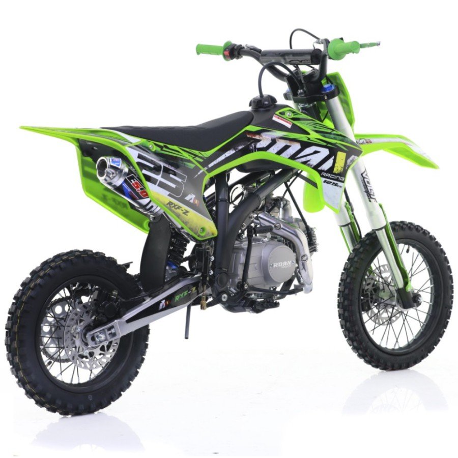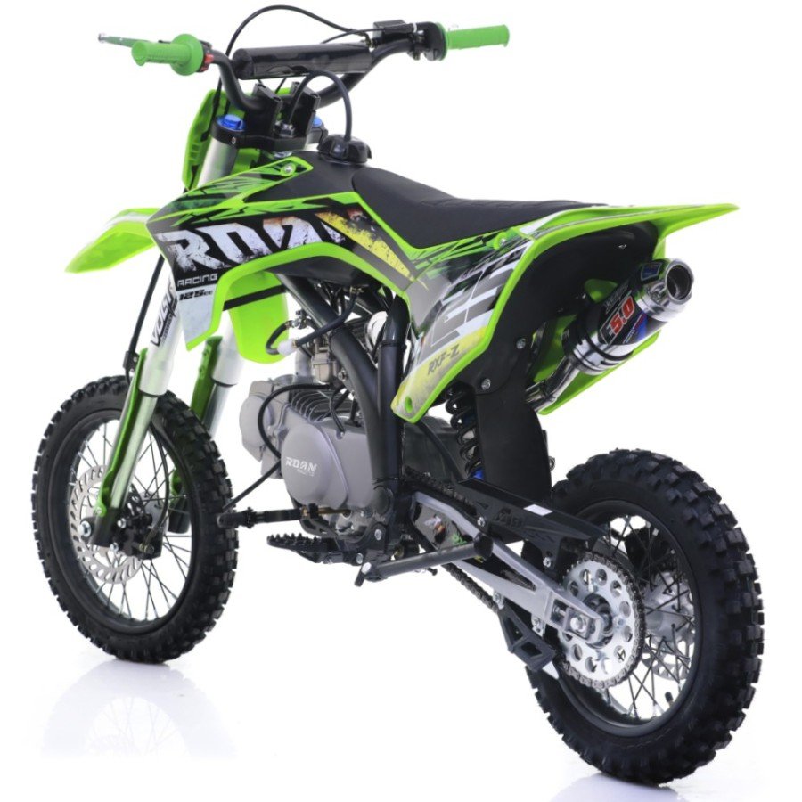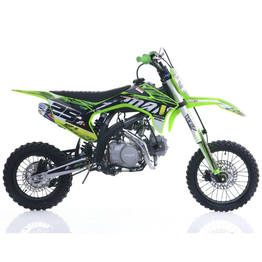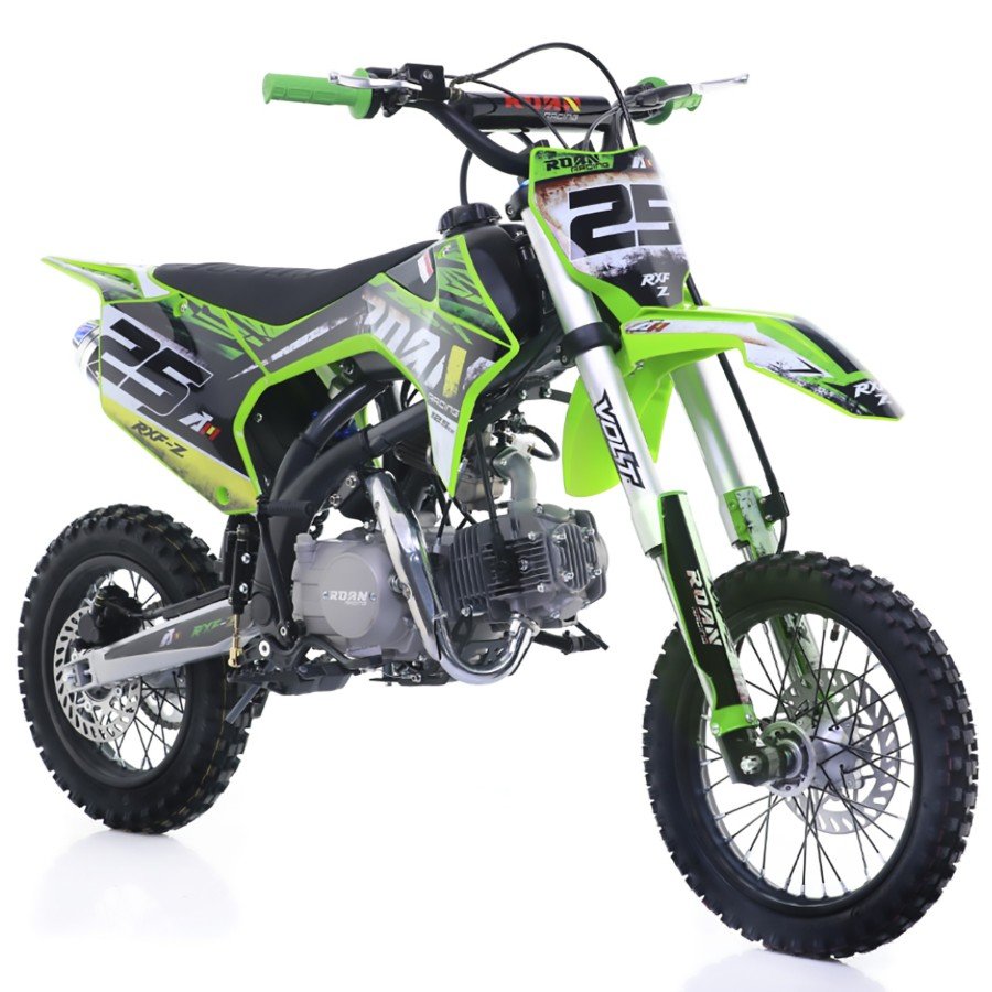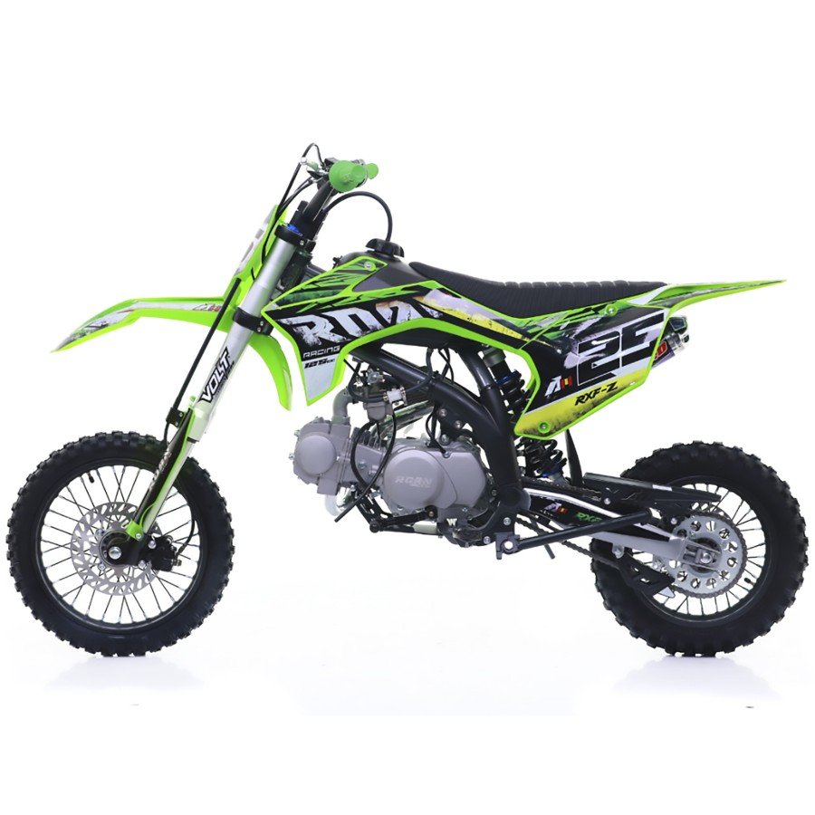 Pit bike gasolina para niños 125cc, motor 4 tiempos con arranque a pedal y 4 marchas. Llantas SDG 14/12″ ; Horquillas invertidas y frenos hidráulicos.