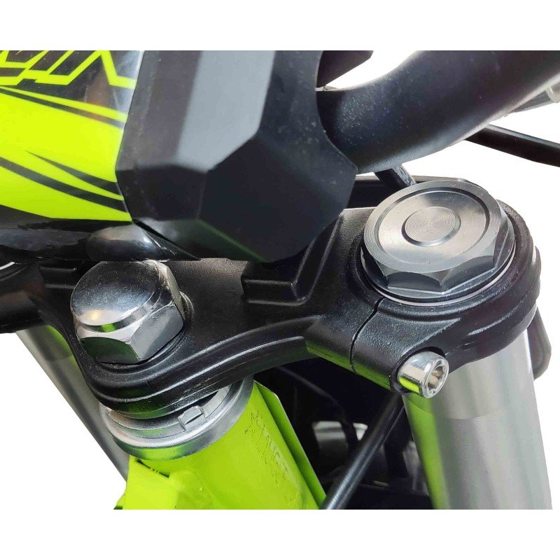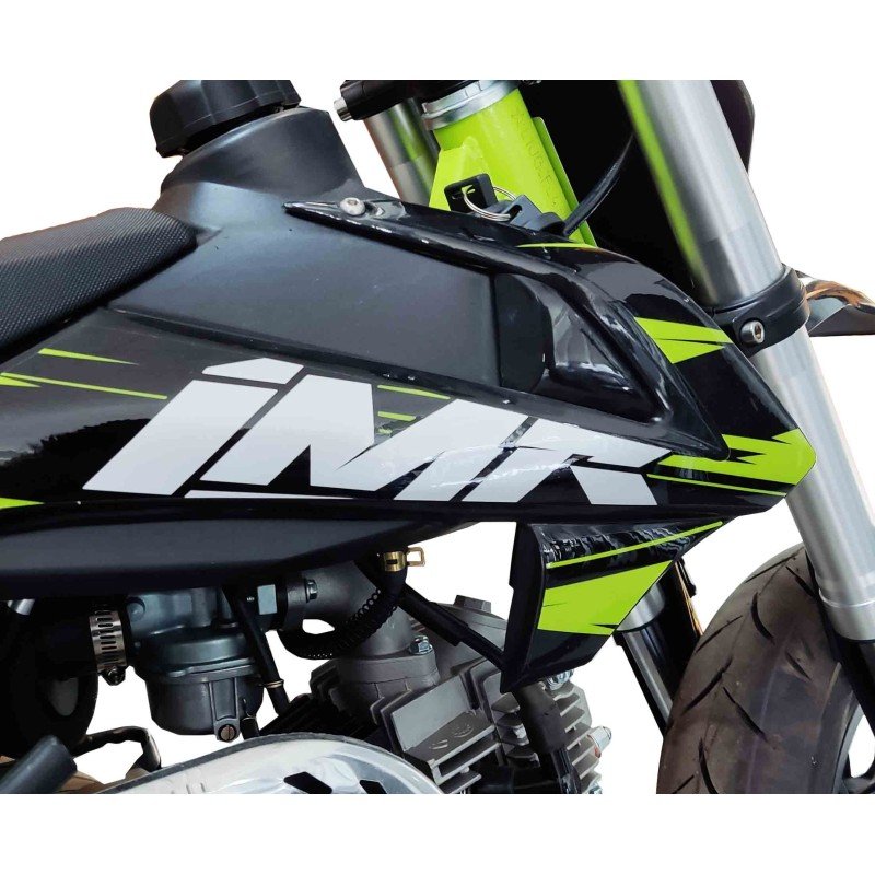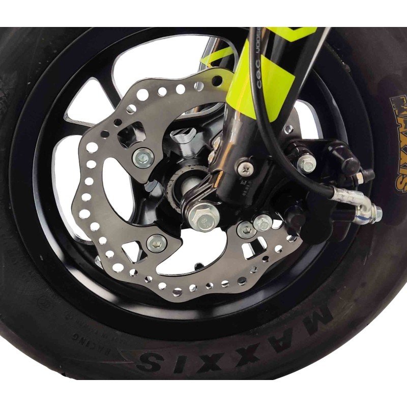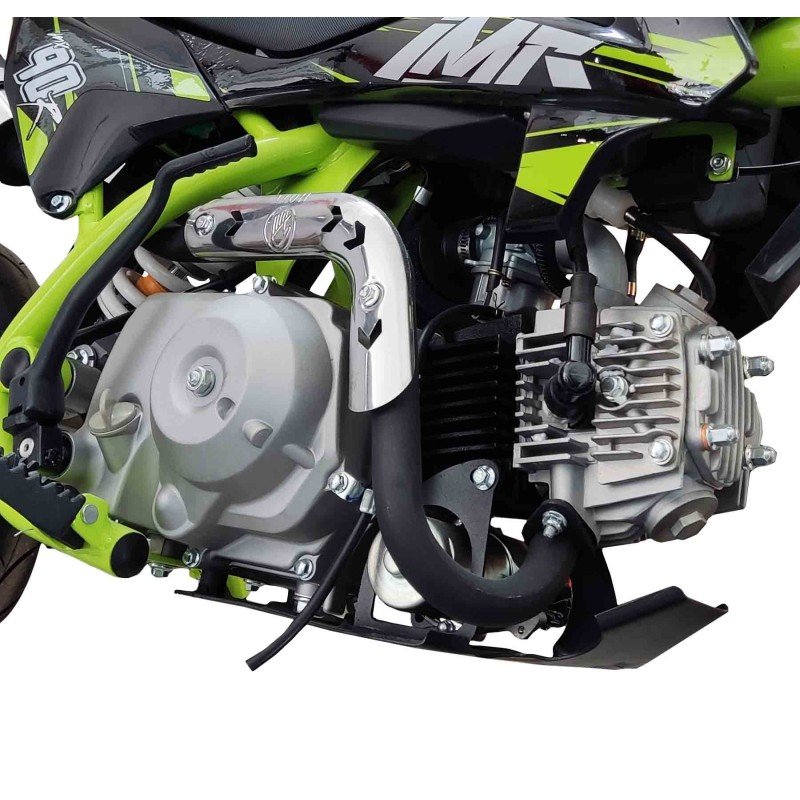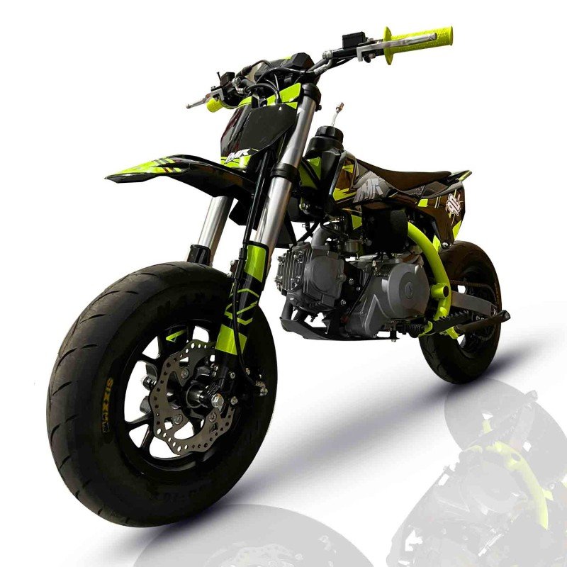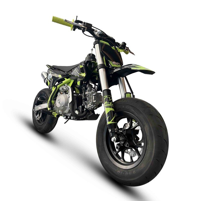 Motard con motor de 4 tiempos y 90cc, refrigerada por aire. Disfuta de su potencía de 5,9cv y cambio de 4 marchas semiautomatico. ¡Su cómodo arranque eléctrico te encantará! Chasis de acero tubular tipo Copa. Amortiguación delantera con horquilla invertida de 590mm y amortiguación trasera de 270mm modelo. Freno delantero y trasero de disco 190mm. Llanta delantera y trasera de 10 pulgadas. Distancia entre ejes de 1050mm y una altura del asiento al suelo de 620mm.