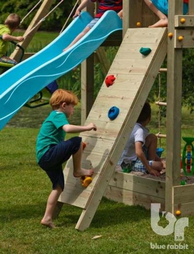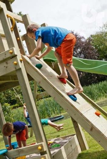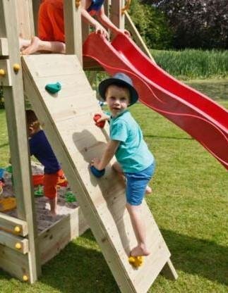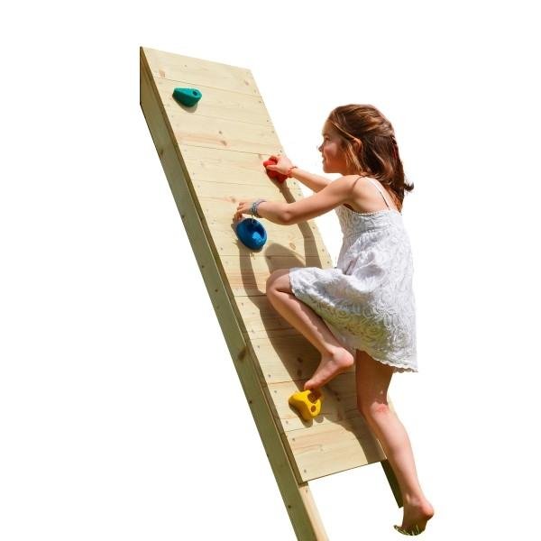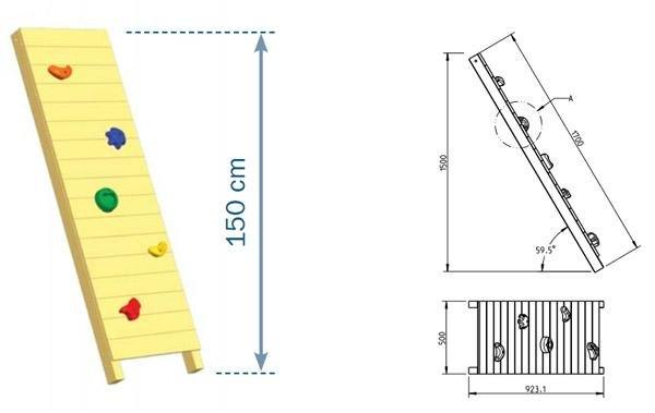 Accesorio para poner en los parques infantiles de Masgames, es un complemento de madera que se compone una rampa de escalada para subir a la plataforma elevada del parque infantil. Este complemento es ideal para acoplar a los parques infantiles de altura a la plataforma de 1,50.