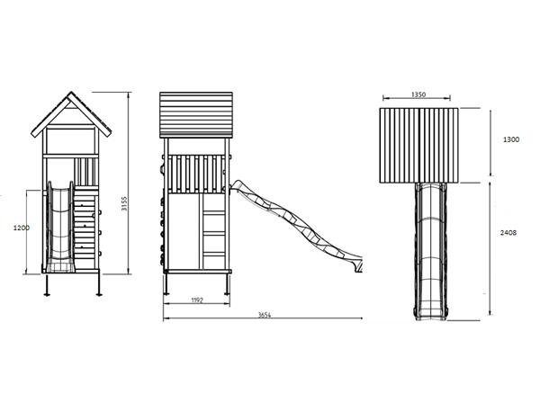 El parque infantil Canigó consiste en una casita de madera elevada que se accede a ella subiendo por una escalera o por la rampa de escalada de la parte trasera. Se puede bajar por la rampa del tobogán. En la base se puede poner arena para jugar. El parque infantil Canigó con columpios tiene una estructura lateral de madera con dos asientos de plástico y cuerdas para columpiarse.