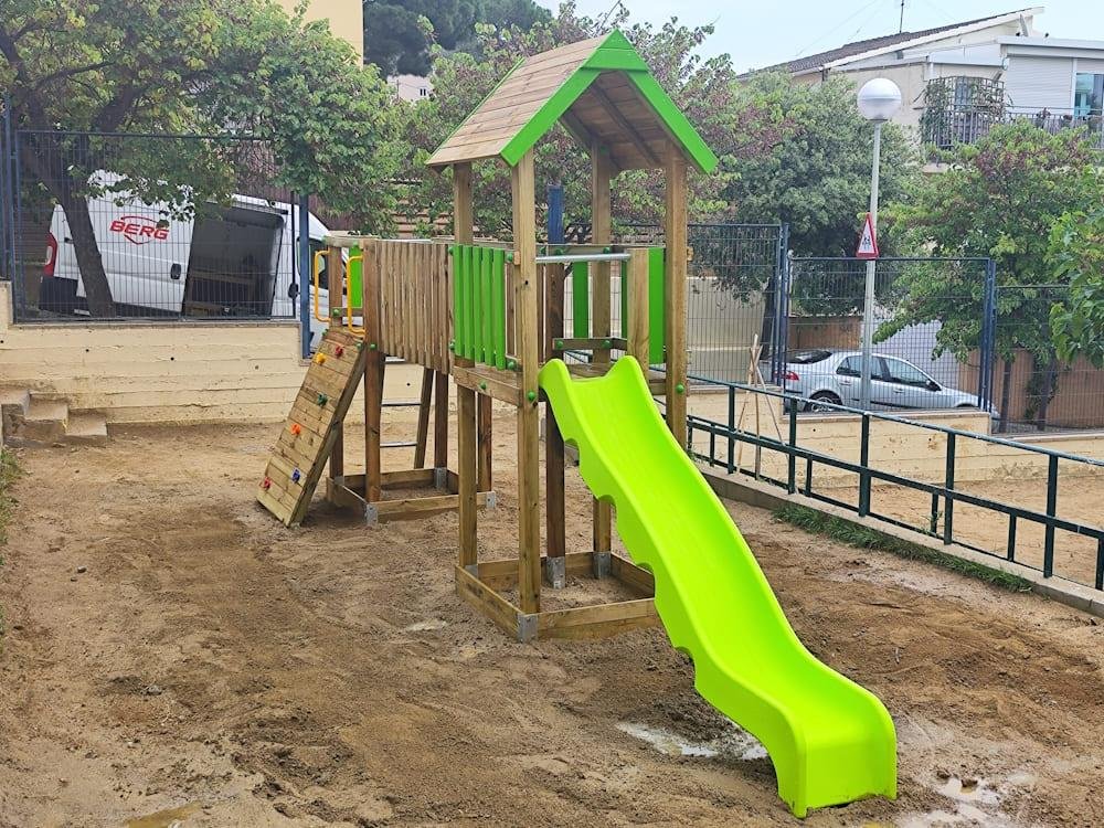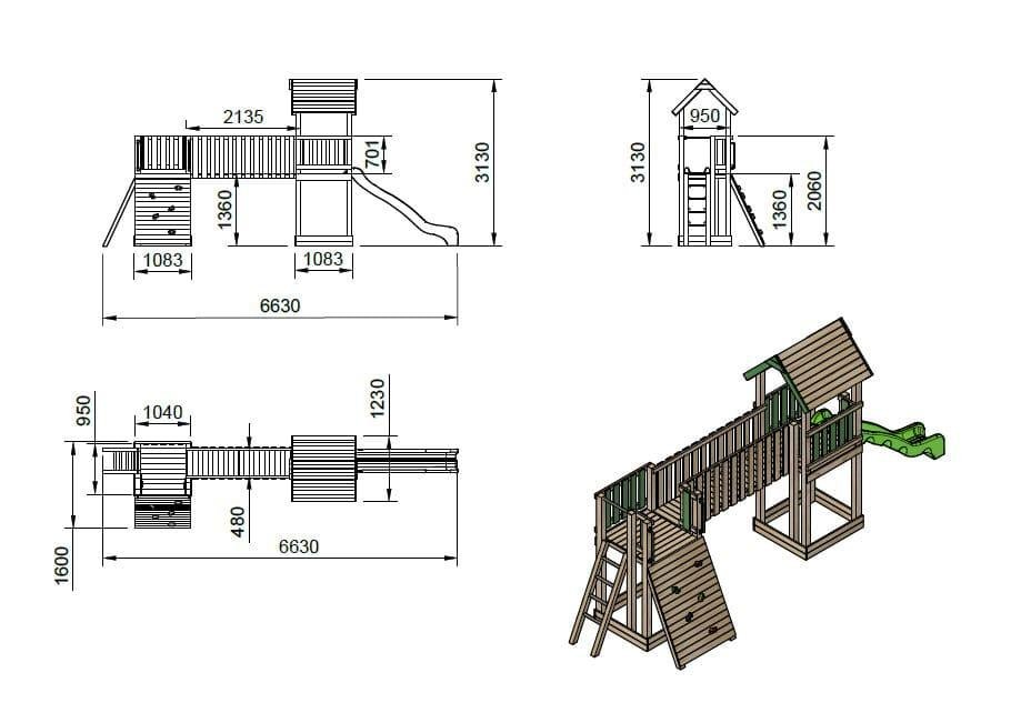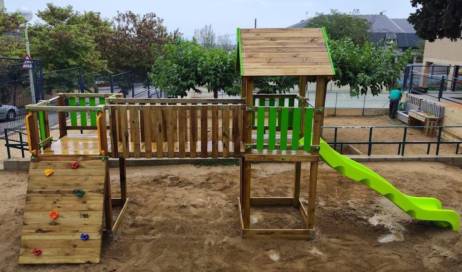 Este precioso parque infantil está fabricado de madera y tiene detalles de madera pintada en verde para conseguir una estructura armónica e integrada con el entorno. La madera utilizada es de pino proveniente de bosques renovables del norte de Europa y está tratada en autoclave nivel IV para garantizar la máxima resistencia al exterior y protegerla de la humedad, lluvia, podredumbre y posibles plagas de insectos.