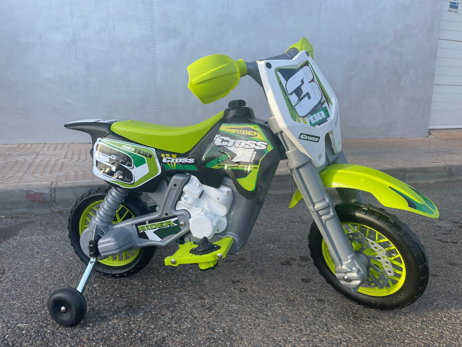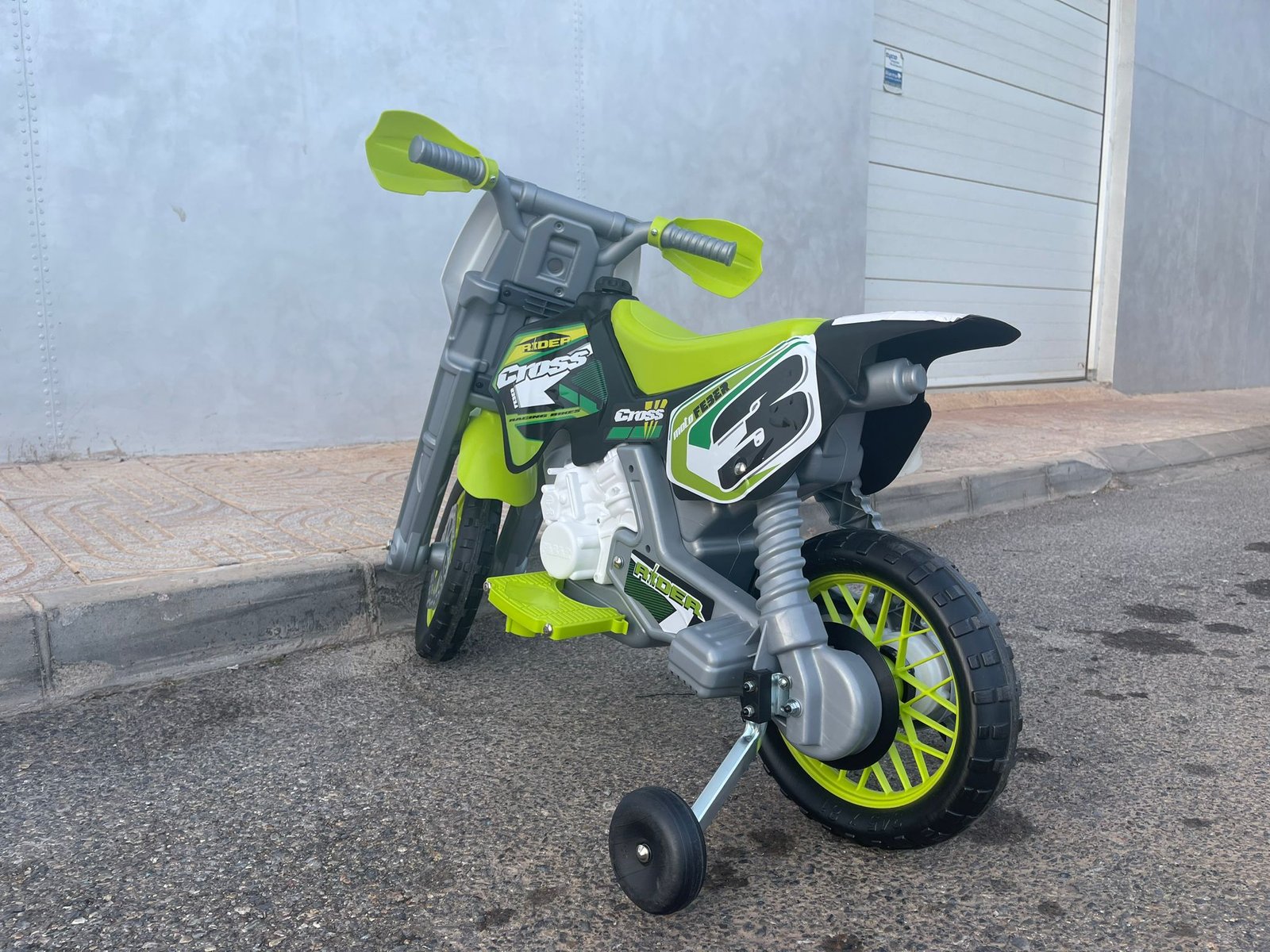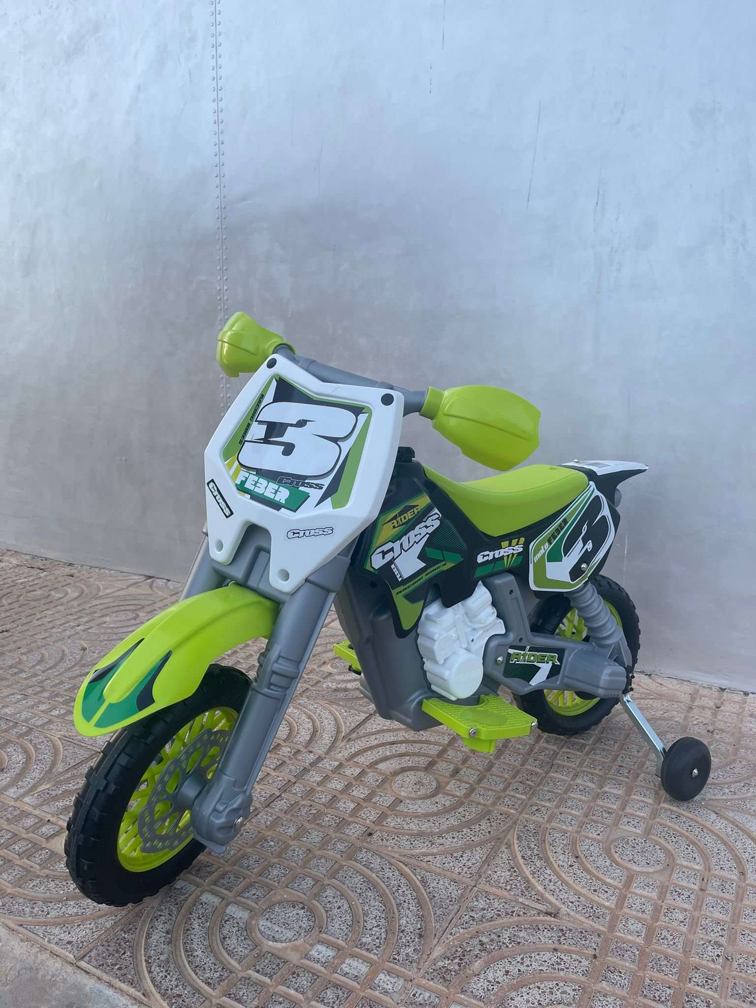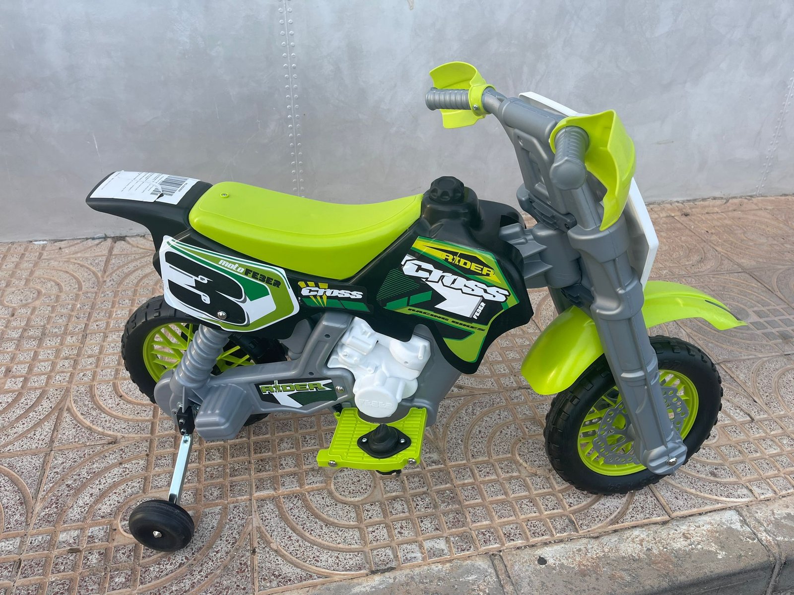 FEBER Rider Cross, es una moto eléctrica que cuenta con acelerador en el pie, freno eléctrico y dos ruedines para mejor la estabilidad, alcanza los 5.3 km/h