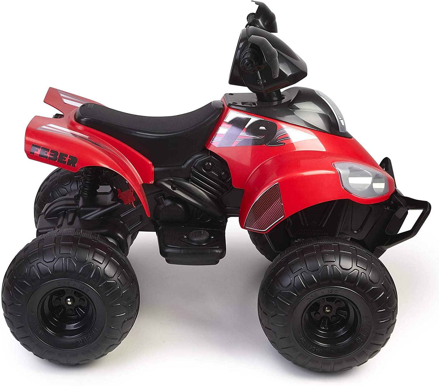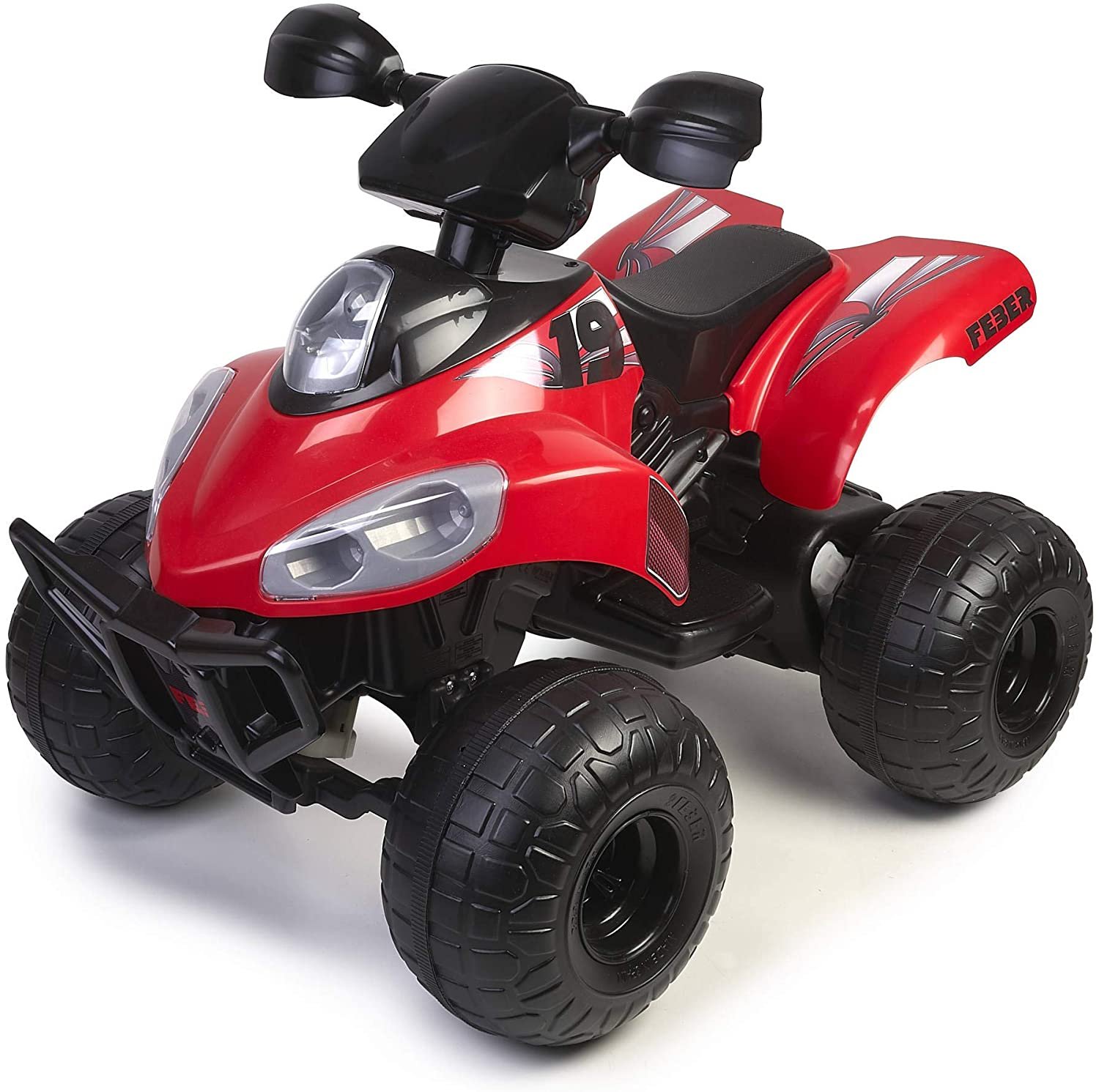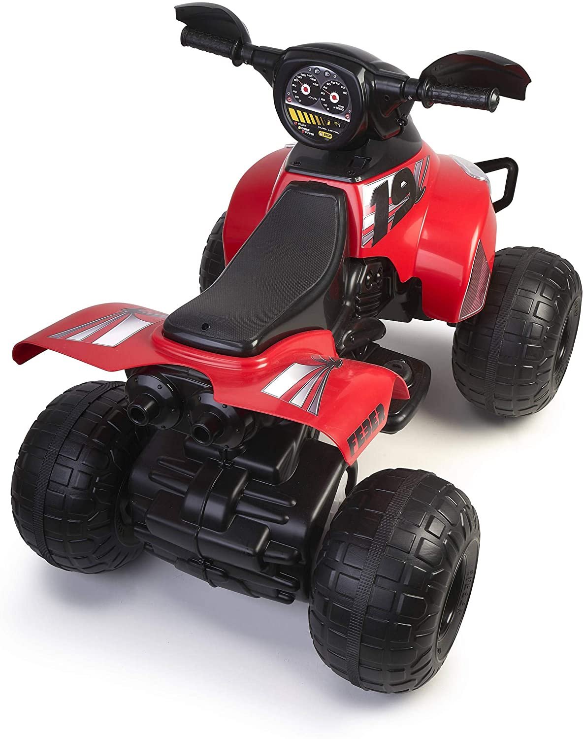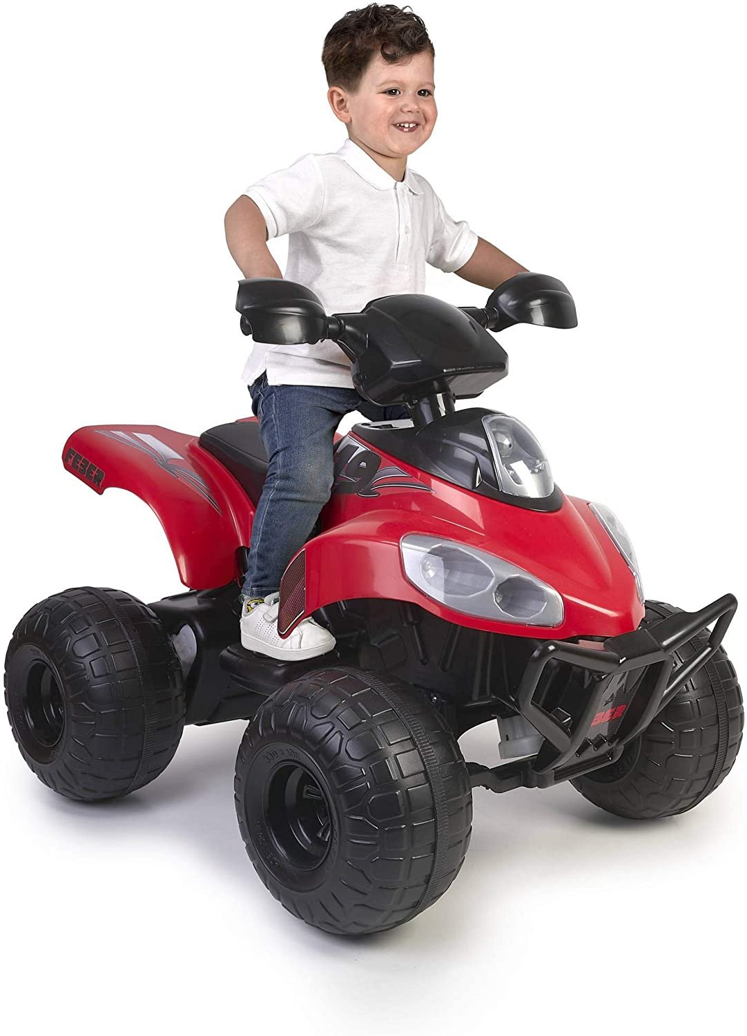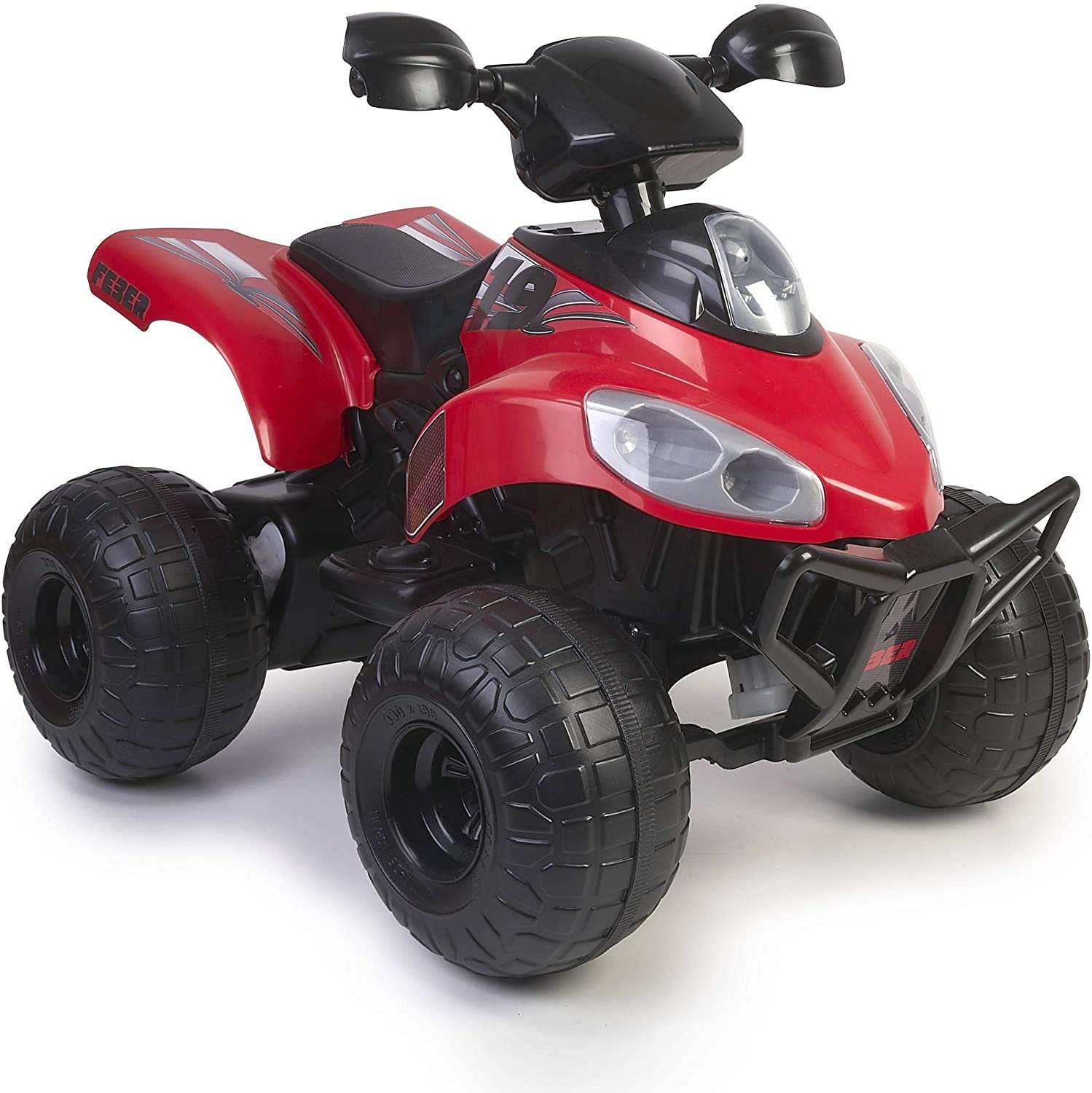 Quad motion 12v tiene marcha hacia adelante y atrás, freno en el pie y faros de imitación halógenas; sus ruedas robustas ayudan a mejorar la estabilidad y alcanza hasta los 5.2 km/h