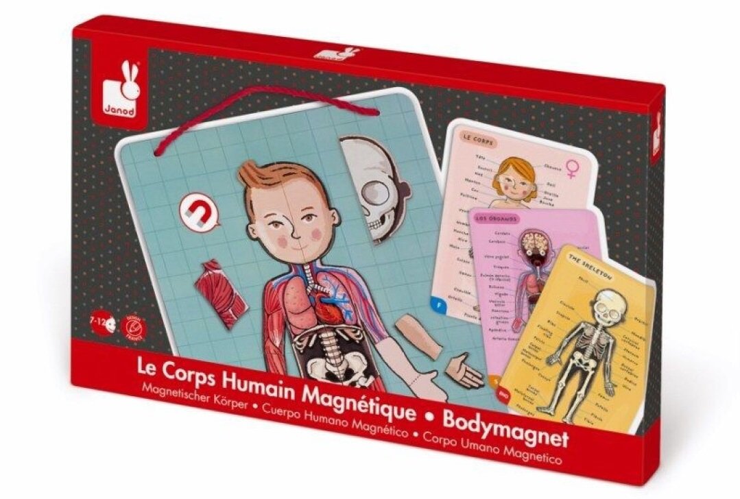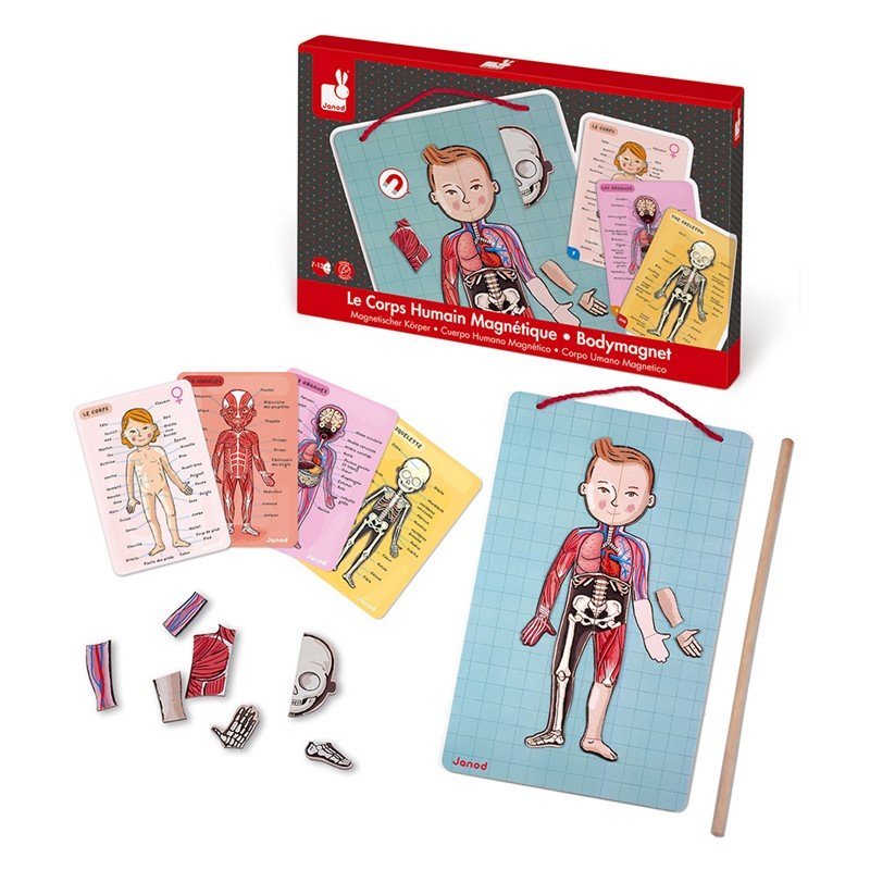 Aprende las diferentes partes del cuerpo humano divirtiéndote! 76 imanes y 1 soporte magnético para recomponer y aprender los nombres de las diferentes partes del cuerpo humano. Incluye 4 tarjetas con información detallada sobre lo siguiente: El esqueleto, los órganos, los músculos y las distintas partes del cuerpo humano (traducidas en francés, inglés, alemán, holandés, español, catalán, vasco, italiano, ruso, danés y japonés). Incluye una varilla indicadora de madera