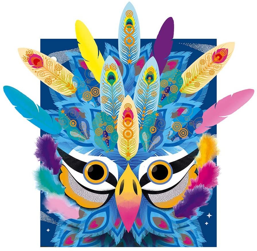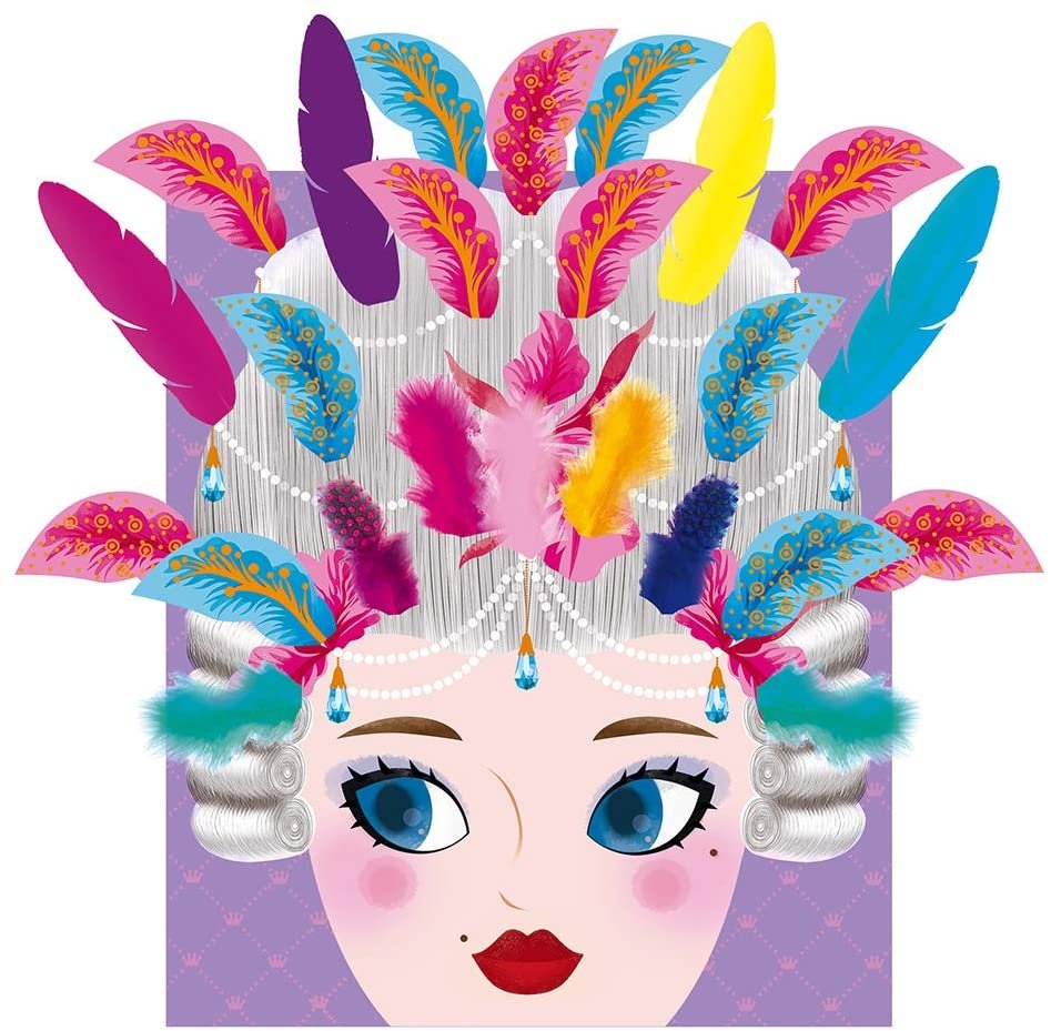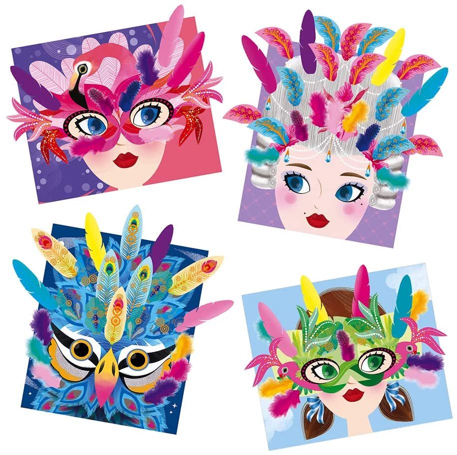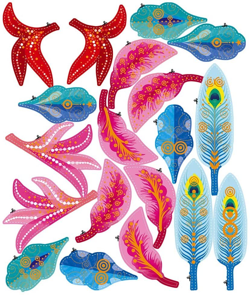 Contenido: 4 láminas para decorar con 40 plumas, 2 hojas de plumas en papel para recortar, 1 plancha de pegatinas de protección y 4 elásticos