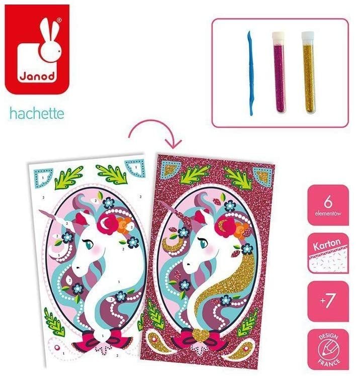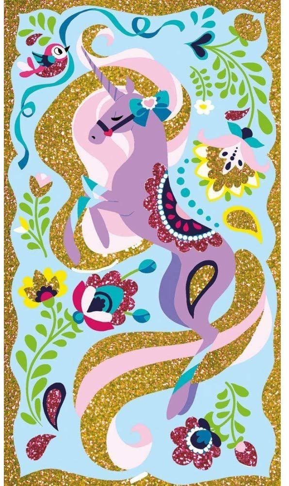 UNA ACTIVIDAD FUNDAMENTAL: este estuche creativo permitirá a los niños de 6 años en adelante crear unos preciosos cuadros que invitan a soñar con el tema de moda de los unicornios. Solo hay que rascar el soporte de cartón para que aparezcan las partes adhesivas y rellenarlas cuidadosamente con la purpurina rosa y dorada. Contiene todo lo necesario para hacer tres cuadros distintos y un folleto explicativo con los ejemplos y las instrucciones.
