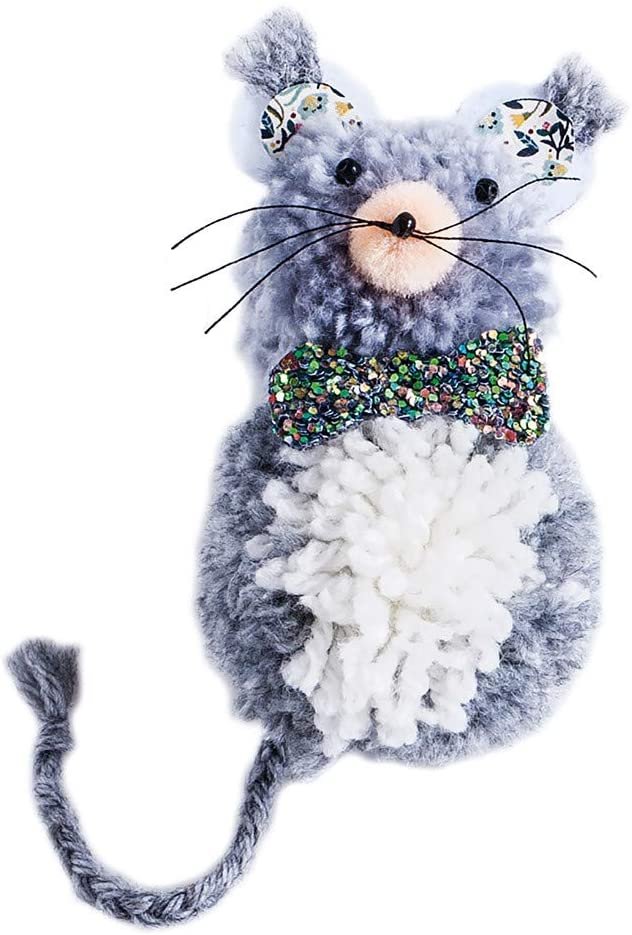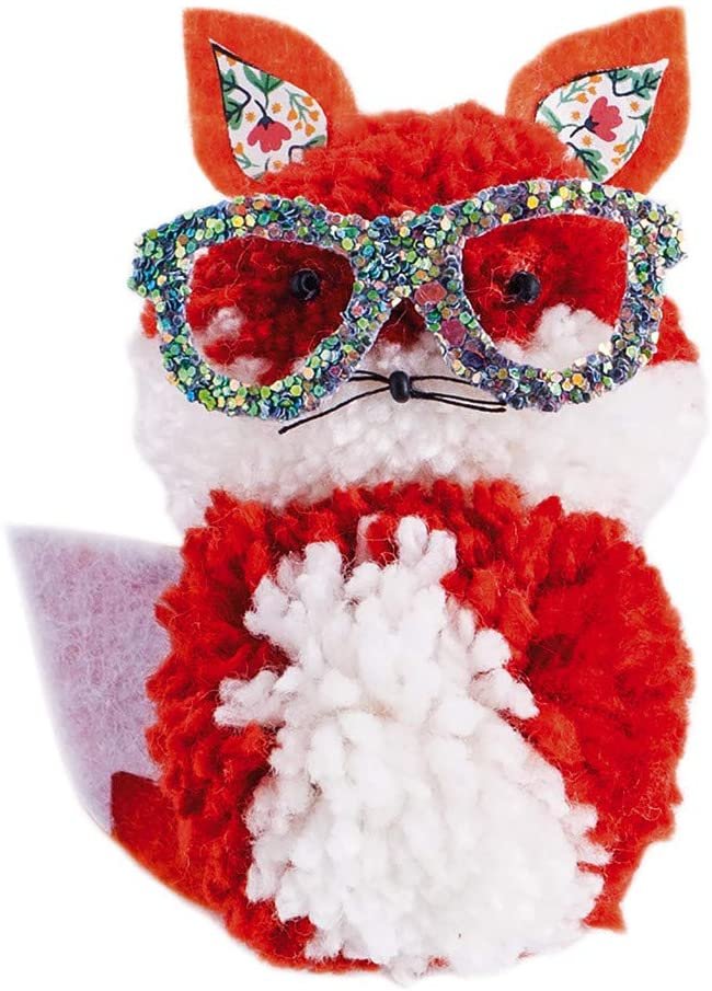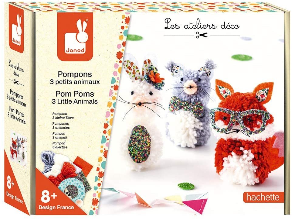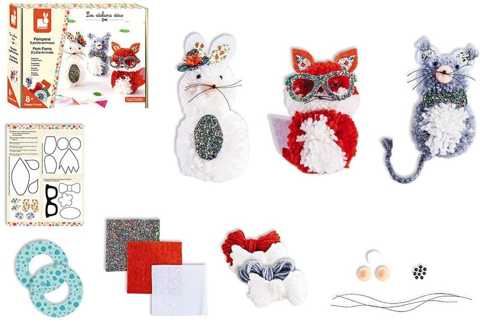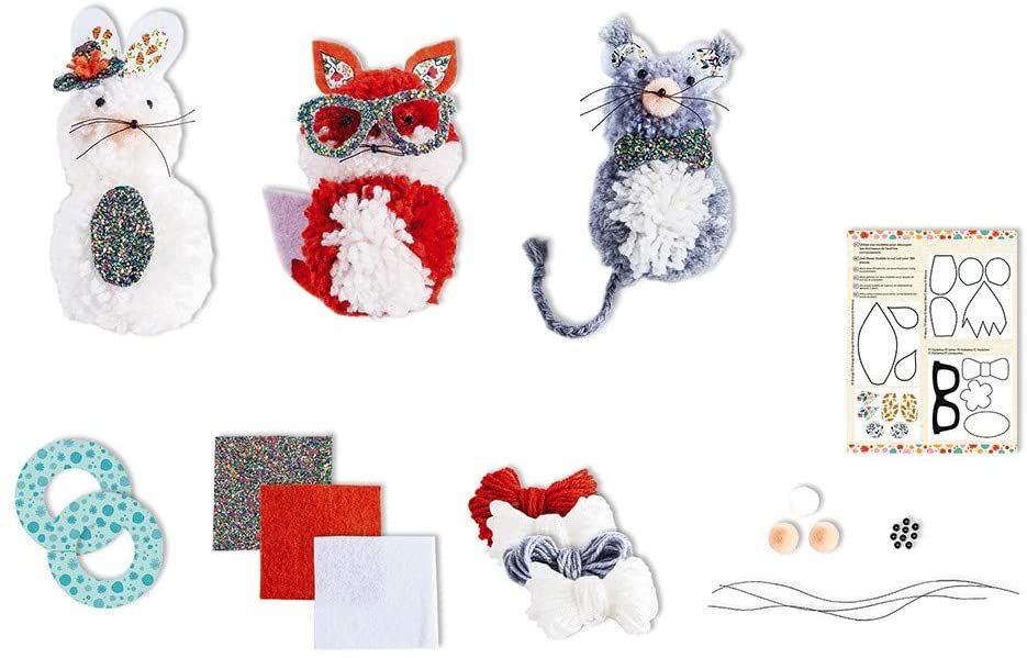 Contenido del set : 2 círculos de cartón, 4 ovillos de lana, 2 láminas de fieltro, 1 lámina de cuero sintético con purpurina, 9 perlas negras, 3 minipompones, hilo negro, 1 hoja impresa