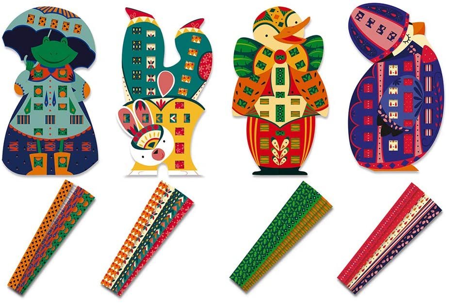 CARACTERÍSTICAS: contiene 4 personajes para decorar y vestir y 20 tiras de papel; materiales utilizados: cartón y papel; franja de edad recomendada: a partir de 5 años
