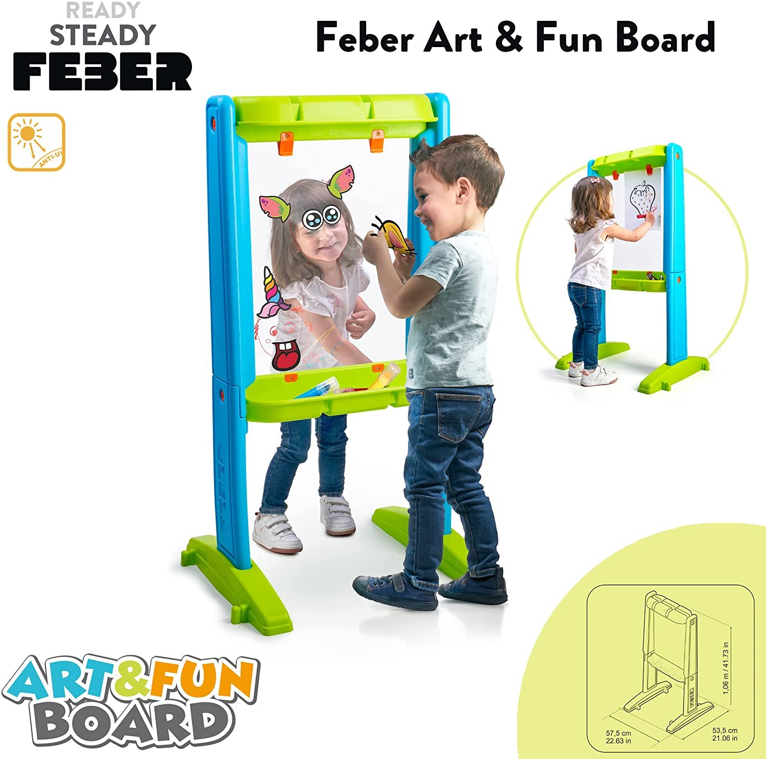 ART&FUN BOARD es una pizarra transparente y artística para usar por ambos lados, con pegatinas para decorarla. Incorpora especiales sujeciones para colocar las plantillas incluidas o las que se quieran y dibujarlas. También se puede usar la pizarra libremente sin plantillas. Incluye 2 rotuladores y bandeja Para jugar dentro y fuera de la casa. Ayuda al desarrollo de las habilidades cognitivas y motoras finas a la vez que fomentara el juego de rol. Recomendado para niños mayores de 3 años. Peso del producto: 8kg (aprox)