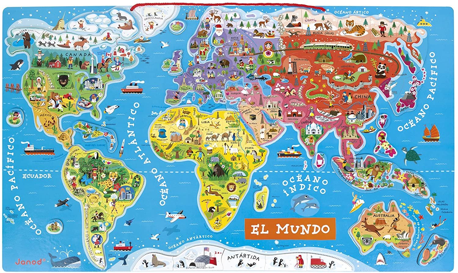 Janod J05503 – Puzzle magnético del Mundo de madera, en Español, 92 piezas