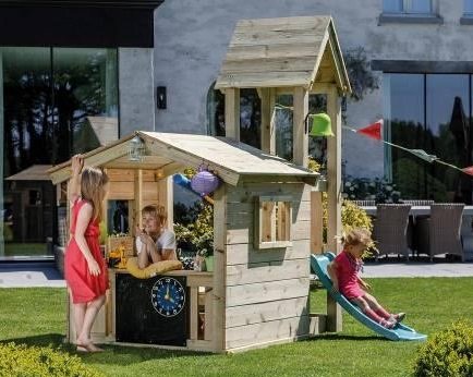 El parque infantil Lookout S está compuesto por una casita y al lado una torre con un tobogán. Esta combinación parece una iglesia con un campanar.