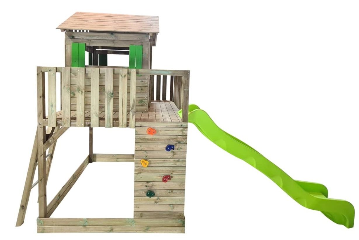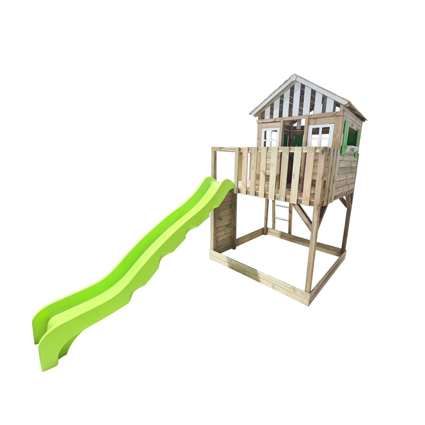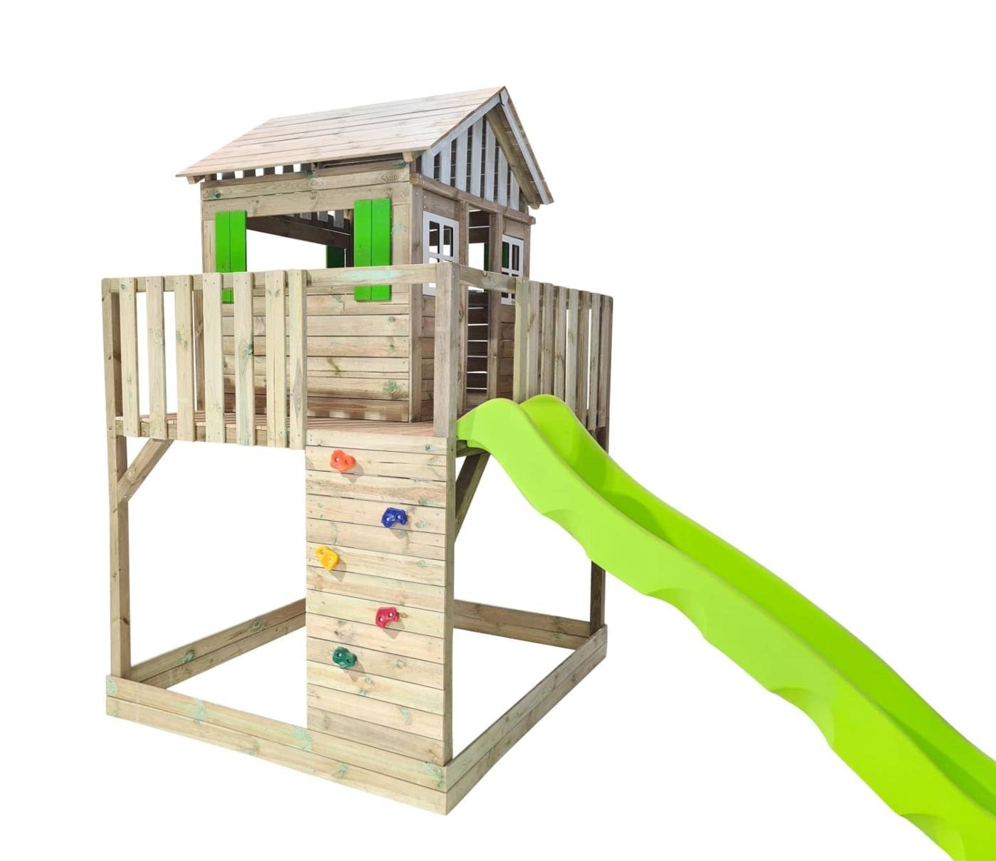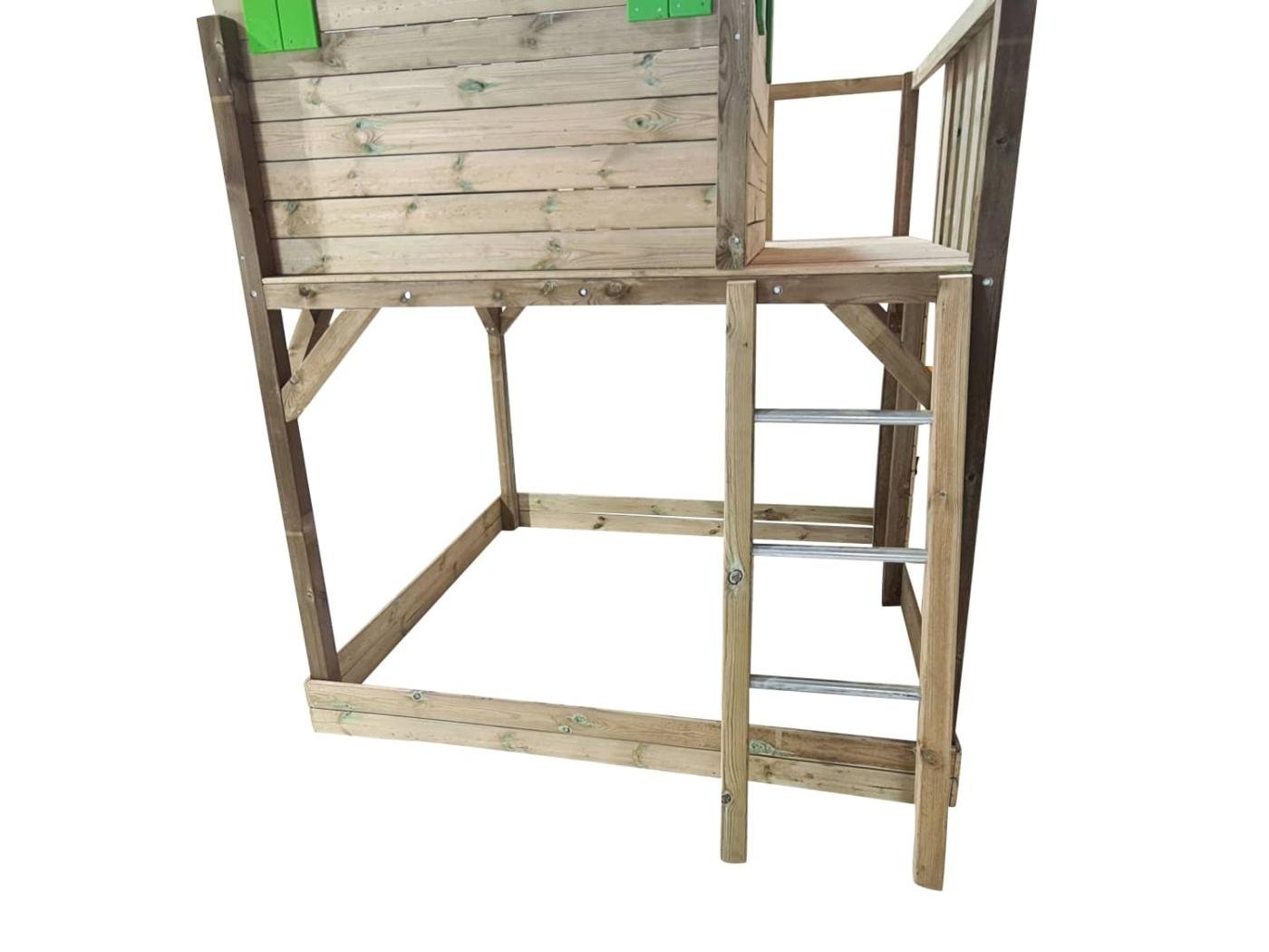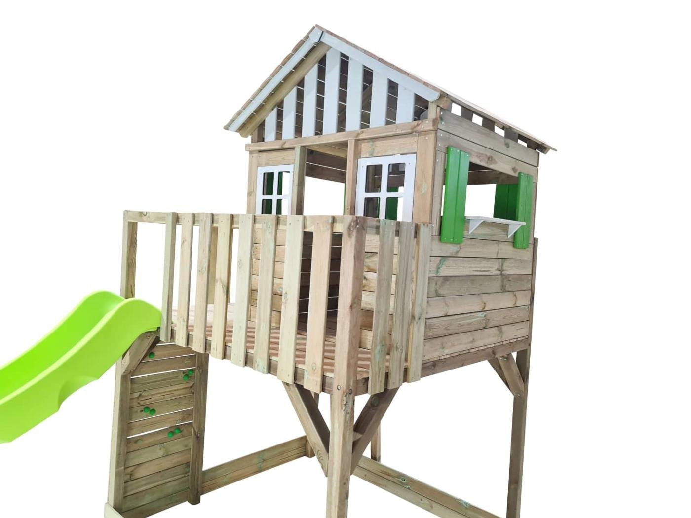 El parque infantil MASGAMES LOLLIPOP L es una amplia plataforma elevada a 145 cm de altura , en la parte de arriba hay una casita de madera Lollipop Horeca, sin la puerta, y además tiene un amplio balcón. Se accede a la plataforma por la pared de escalada o bien por una escalera de fácil acceso con barandilla. Se puede bajar por la rampa de tobogán. Debajo de la plataforma hay espacio para un amplio arenero.