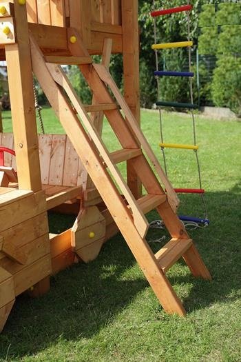 Una torre con un techo de madera único e impresionante y cómodas escaleras de entrada de madera,