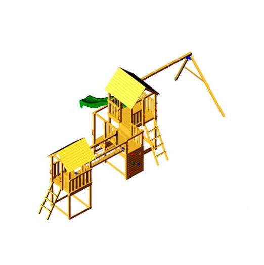 – La Torre PentHouse que se trata de una casita de madera elevada c que se accede a ella subiendo por unas escalera de madera o por una escalera de cuerda para trepar, tiene un mirador y se puede bajar por el tobogán. Además tiene acceso al puente que une a la otra torre. En la base se puede poner arena para jugar.