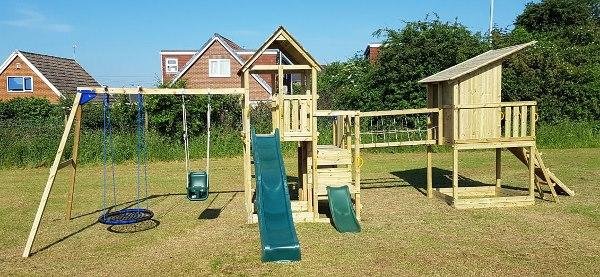 – La Torre PentHouse que se trata de una casita de madera elevada c que se accede a ella subiendo por unas escalera de madera o por una pared de escalar, tiene un mirador y se puede bajar por el tobogán. Además tiene acceso al puente que une a la otra torre. En la base se puede poner arena para jugar. A la torre PentHouse le acompaña un columpio doble de madera.