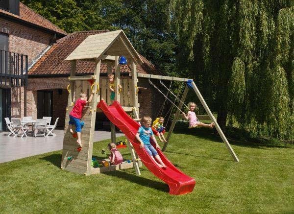 En la rampa se le puede conectar en verano una manguera para que baje el agua por la rampa. Es por tanto una combinación que ofrece muchas posibilidades de diversión para los niños.