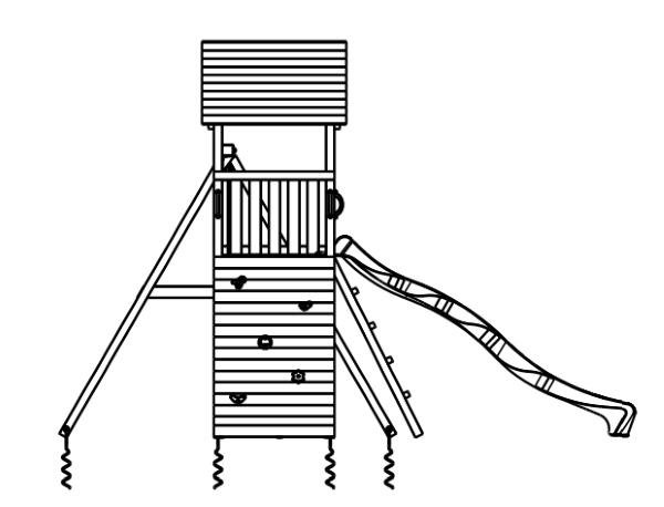 La casita infantil Belvedere incluye las maderas, la rampa de tobogán de color verde claro, los anclajes para fijarlos en un suelo blando de tierra o césped, los tapones de perno, las manijas y las instrucciones de montaje.