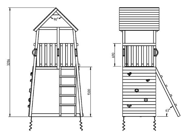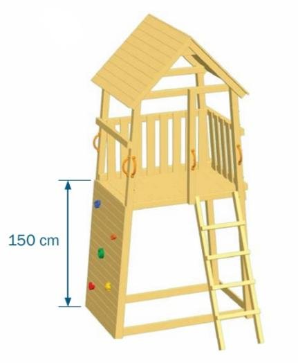 El parque infantil Belvedere XL de la marca Masgames es una torre de madera cuadrada fuerte y bonita para su jardín. Esta versión tiene una altura de la plataforma de 150 cm, en lugar de los 120 de la versión «normal». Como la escalera está en la parte frontal , al lado del tobogán, ocupa menos espacio que otras combinaciones de juegos.