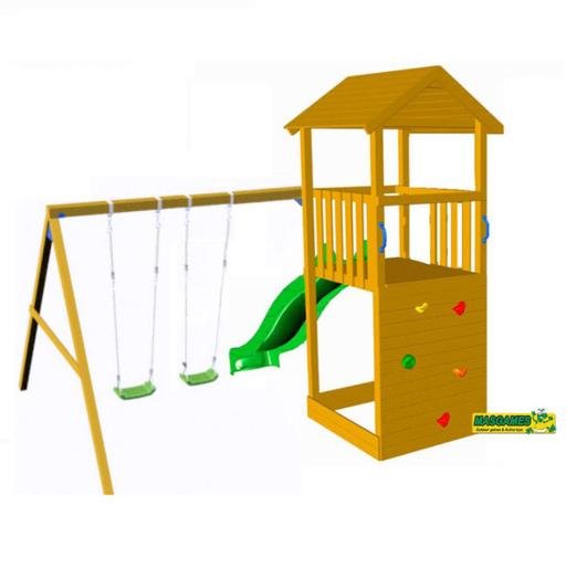 El parque infantil Canigó consiste en una casita de madera elevada que se accede a ella subiendo por una escalera o por la rampa de escalada de la parte trasera. Se puede bajar por la rampa del tobogán. En la base se puede poner arena para jugar. El parque infantil Canigó con columpios tiene una estructura lateral de madera con dos asientos de plástico y cuerdas para columpiarse.