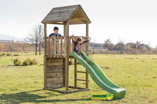 El parque infantil Canigó de la marca MASGAMES es una torre de madera cuadrada fuerte y bonita para su jardín.