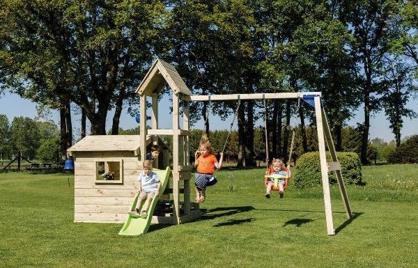 El parque infantil Lookout M + columpios de Masgames está compuesto por una casita y al lado una torre con un tobogán. Esta combinación parece una iglesia con un campanar.