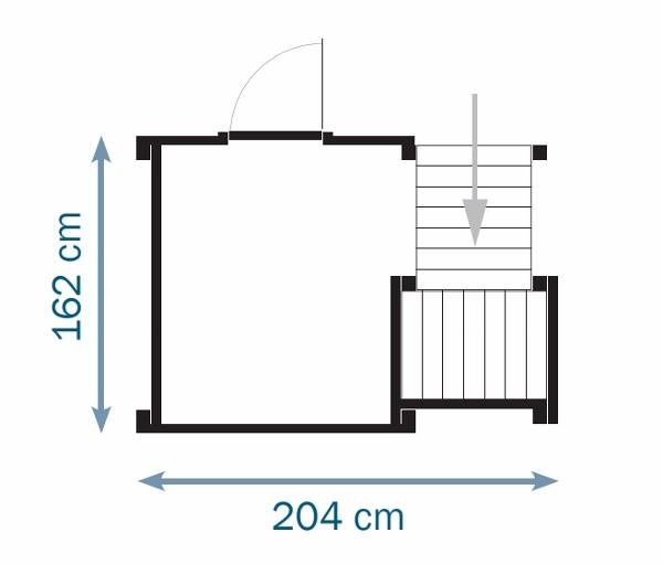 La casita tiene en un lado una ventana, en su lado opuesto una puerta a media altura, luego en el lateral una barandilla y finalmente en el lado que va conectado a la torre está abierto para poder acceder a la torre.