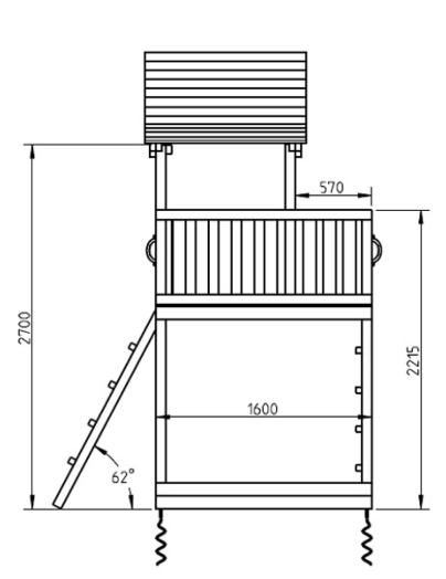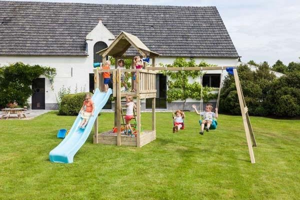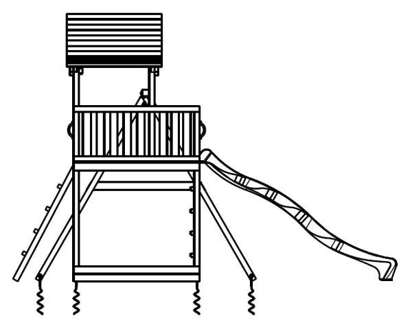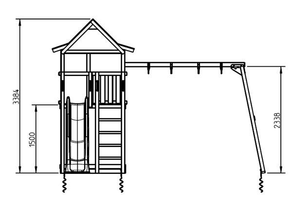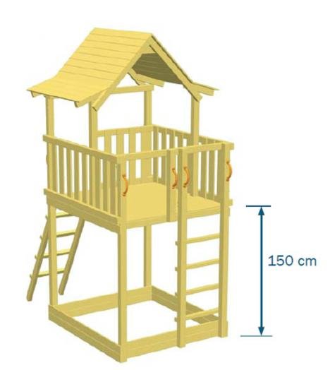 Este parque infantil Pagoda XL con columpio doble consiste en una casita de madera elevada, la torre infantil dispone de dos tipos de escaleras que ayudarán a los niños a subir a la caseta infantil elevada. Una de las escaleras es en vertical (parte delantera) y la otra está inclinada, situada en la parte trasera de la torre infantil. Una vez arriba pueden jugar, vigilar, mirar, descansar, entre otras muchas cosas. Para bajar de la torre infantil Pagoda se utiliza un super tobogán, que rápidamente les conducirá a tierra. El columpio doble está apoyado a la torre infantil y lleva dos asientos.