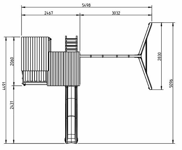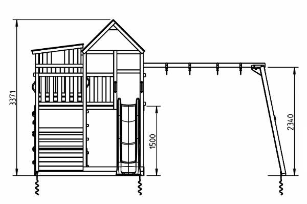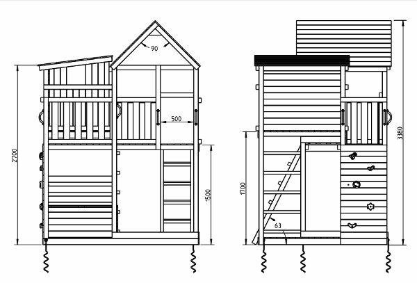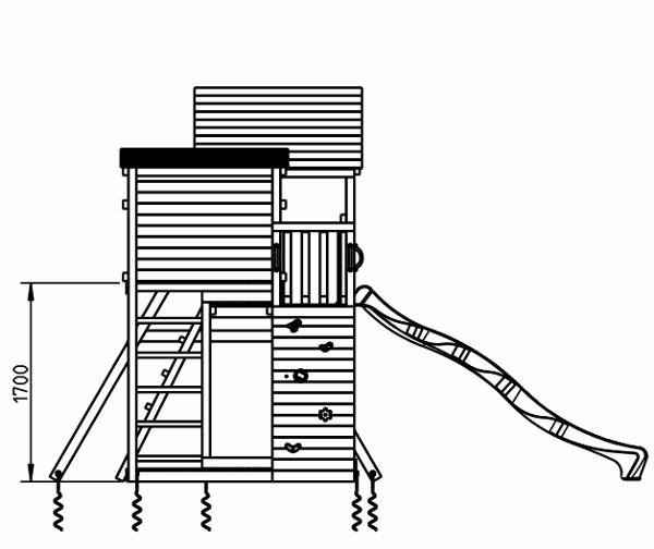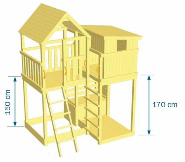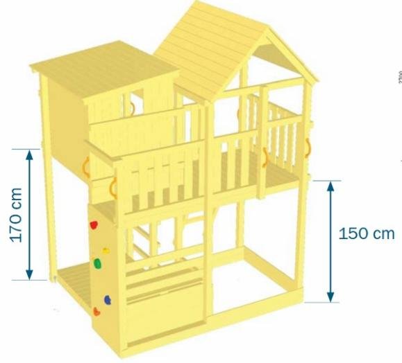 El parque infantil Torre Palazzo + columpio es una torre de madera cuadrada fuerte y bonita para su jardín. El parque infantil Torre Palazzo de Masgames es un parque grande de dos alturas y 4 accesos diferentes al segundo piso. El parque Palazzo tiene la torre con balcón a 150 cm de altura. La Cabaña agregada está a 170 cm